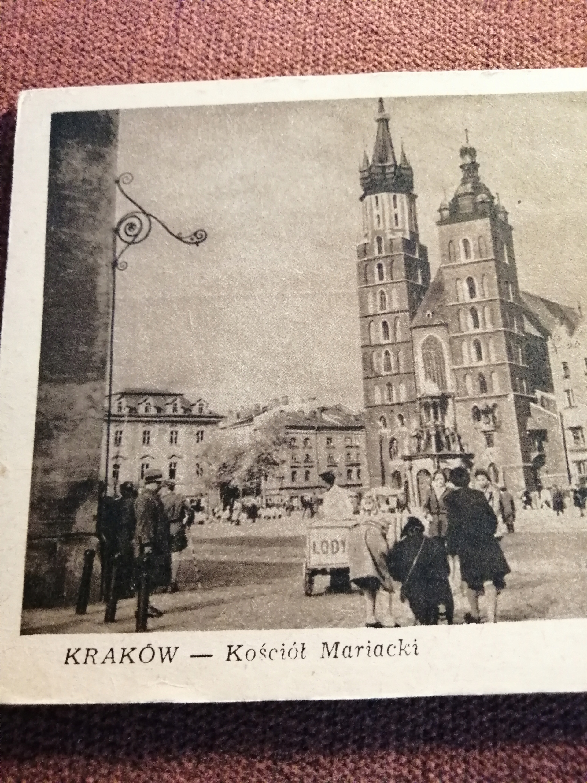 KRAKÓW 1948- KOŚCIÓŁ MARIACKI - WÓZEK Z NAPISEM LODY