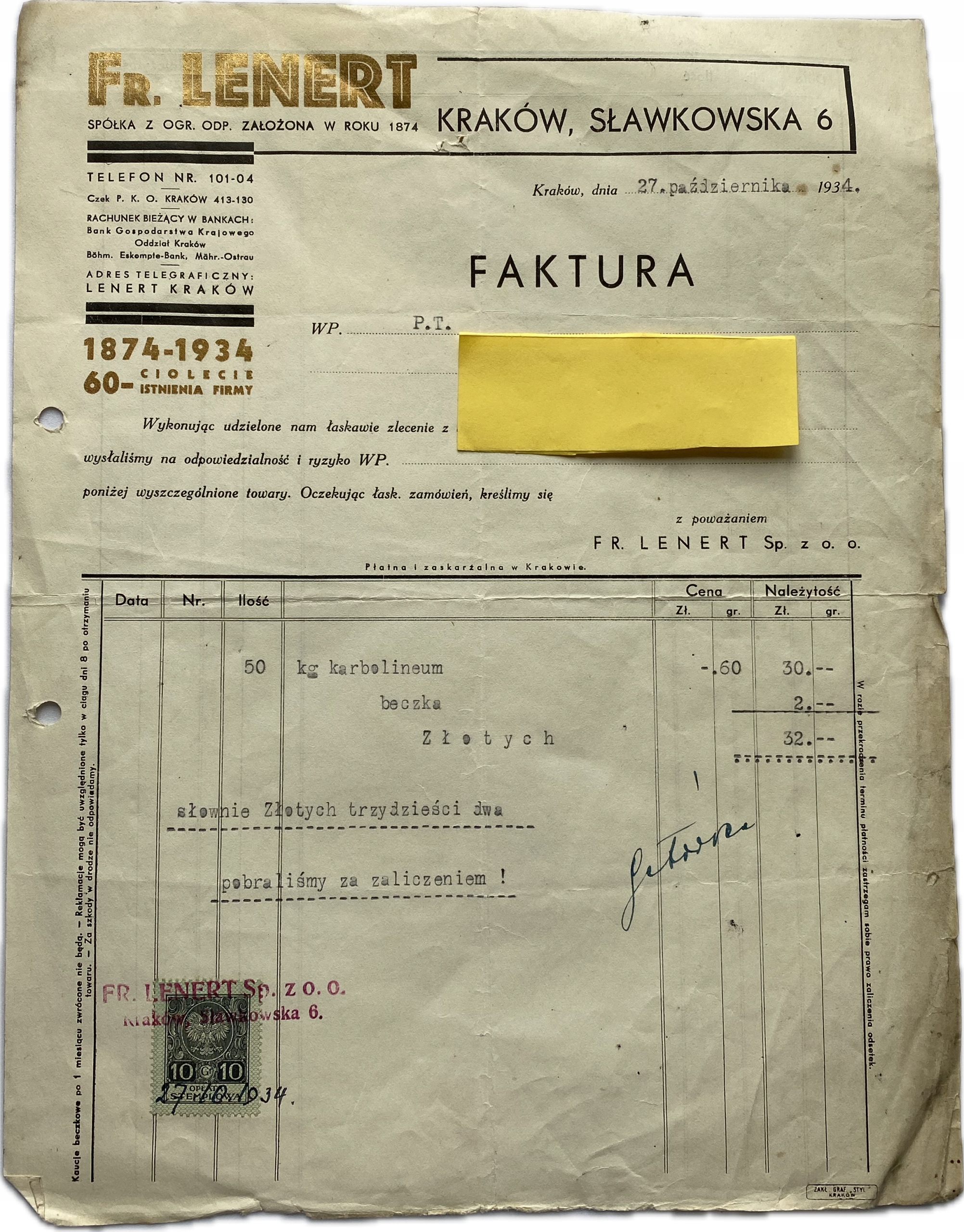 КРАКОВ ЛЕНЕРТ ФАКТУРА 1934 г.
