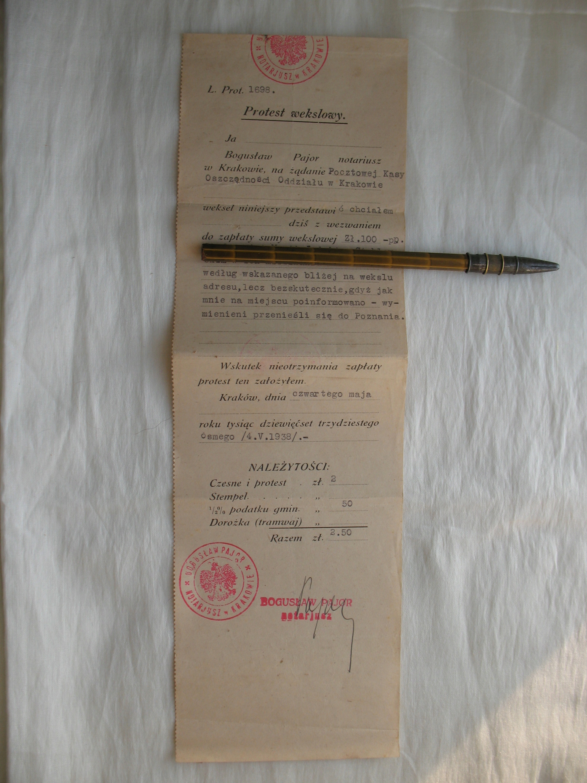 Старый, оригинальный предварительный вексель протест с печатью нотариуса в Кракове. Оригинал Знакомство: 1938. Размеры: 105 x 340 мм. Поведение: по моему мнению -db, следы складывания в несколько частей, небольшая грязь, переоценить, желтость бумаги, все видны на сканировании. Не стесняйтесь делать покупки