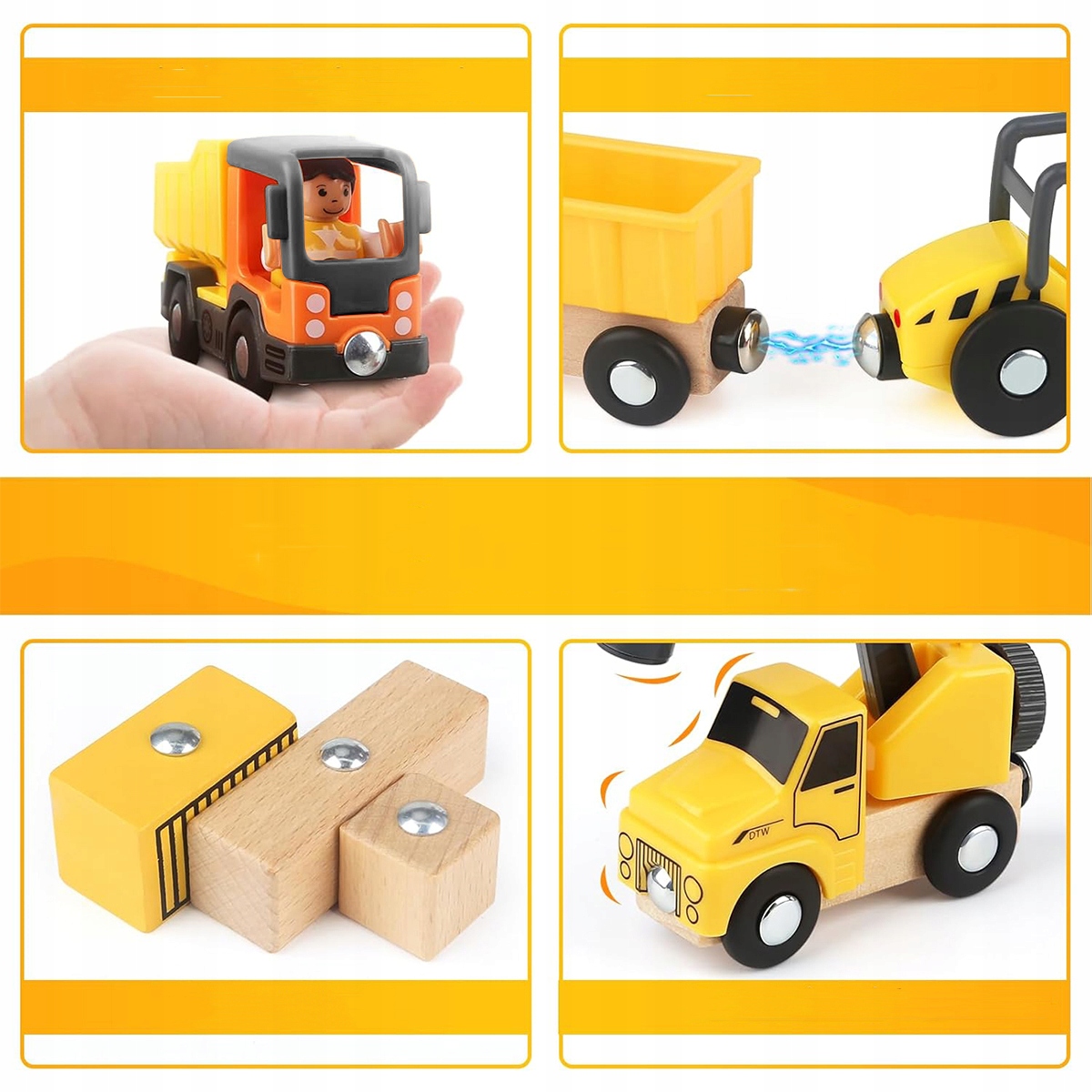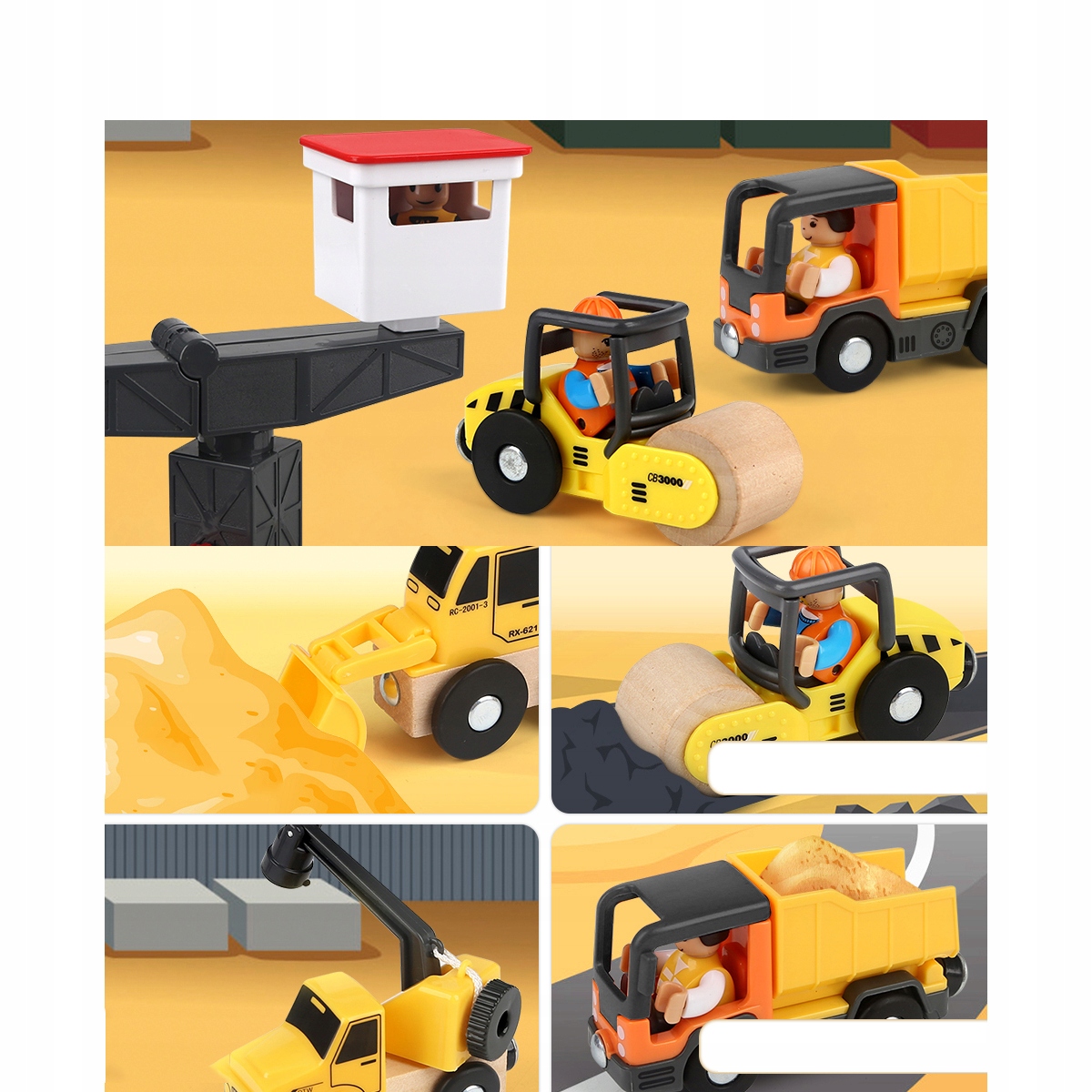 Все детские строительные машины на строительной площадке оснащены магнитными деталями, которые можно прикрепить к вагонам. Колеса этих строительных машин подходят ко всем популярным маркам деревянных железнодорожных путей, поэтому дети могут насладиться сочетанием городского строительства и дорожного движения.