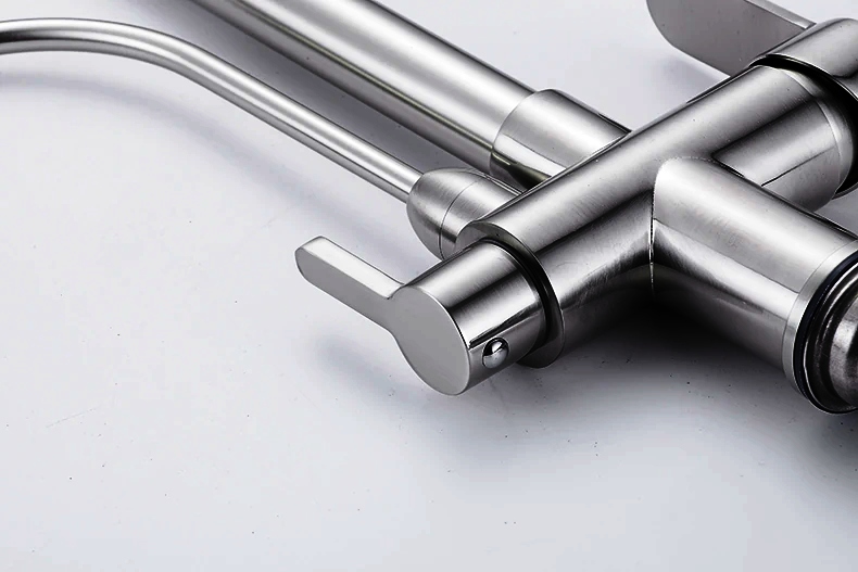Можно с уверенностью сказать, что кухонную фурнитуру и аксессуары стального цвета можно считать хитом последних сезонов. Стальной трехходовой смеситель вписывается в эту тенденцию.