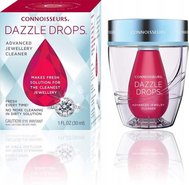 Connoisseurs Dazzle Drops — продвинутый агент для чистки золотых украшений, на этом чистка в грязном растворе заканчивается. Контейнера Dazzle Drops достаточно для приготовления 80 чистящих растворов. В комплект входит щеточка для чистки и специальная ложка, в которую теперь можно положить больше украшений. Современная упаковка проста в использовании, не оставляет пятен и пригодна для вторичной переработки.