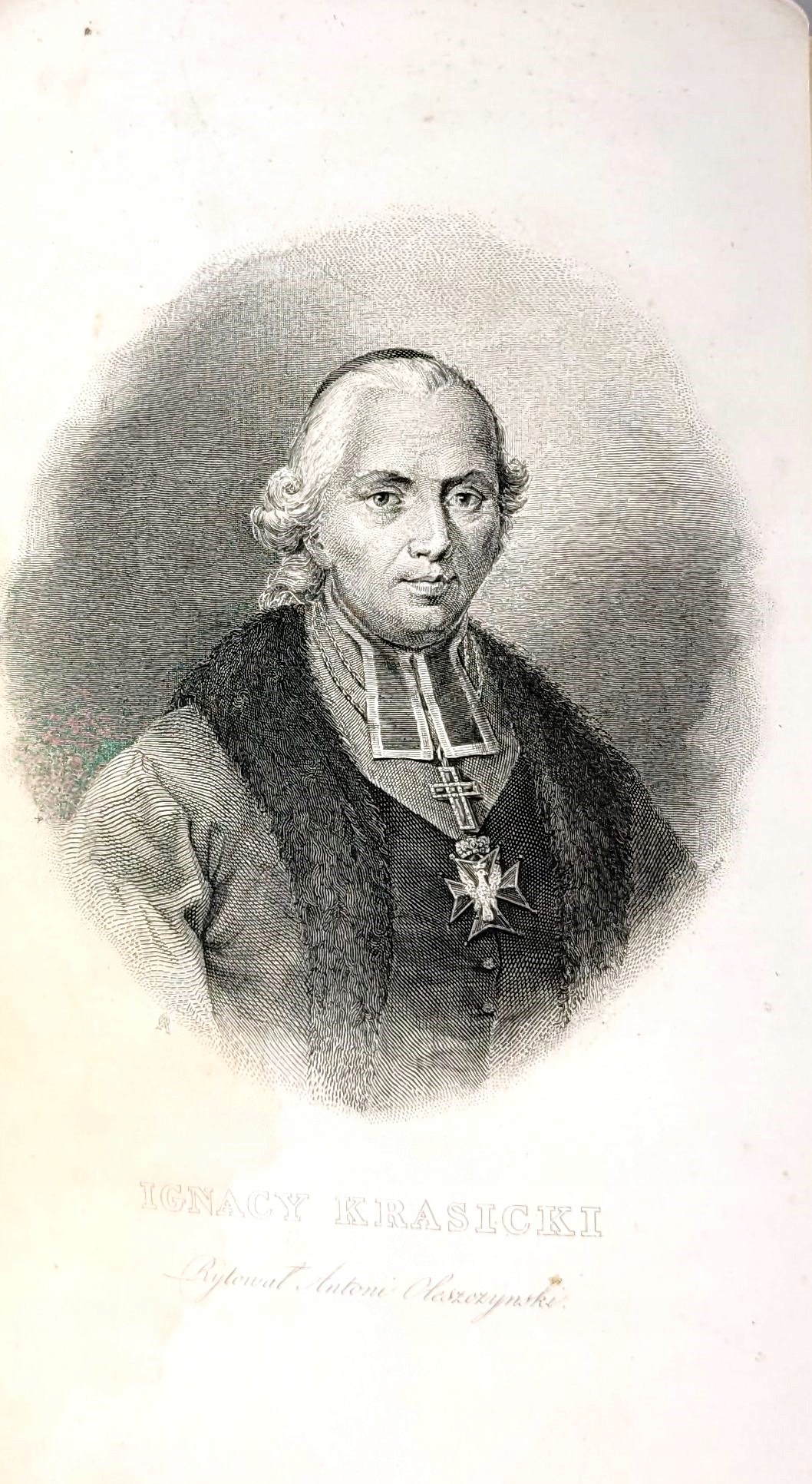 Коллекция самых важных произведений Ignacy Krasicki (1735-1801), опубликованная в Париже в печатном доме Pinard. Содержит, среди прочих сказок и притров; Мюнхен; Антимонахомахия; Чокота война; Песни Оссджана; Буквы; Сатира; Стихи; О риммической и шепчущих работниках; Жизнь благородных мужей из Плутарха.