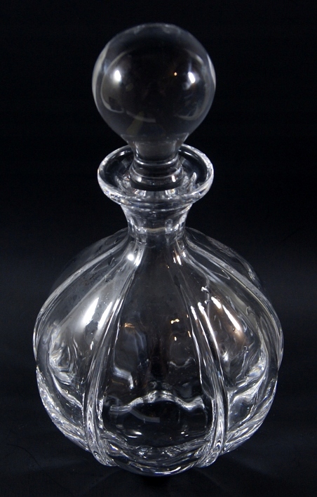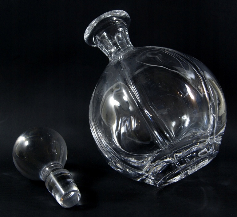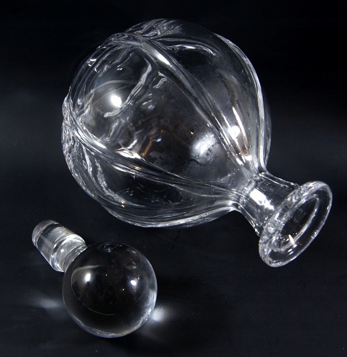 Красивый старый графин, изготовлен из толстого, бесцветного хрустального стекла, полного пробки.