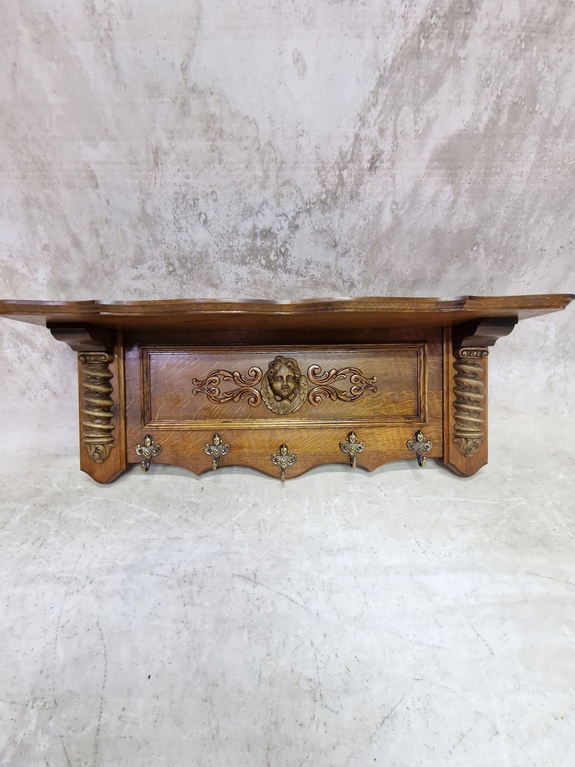 Дубовая вешалка среднего цвета с красивым пластиковым декором (голова, колонны)