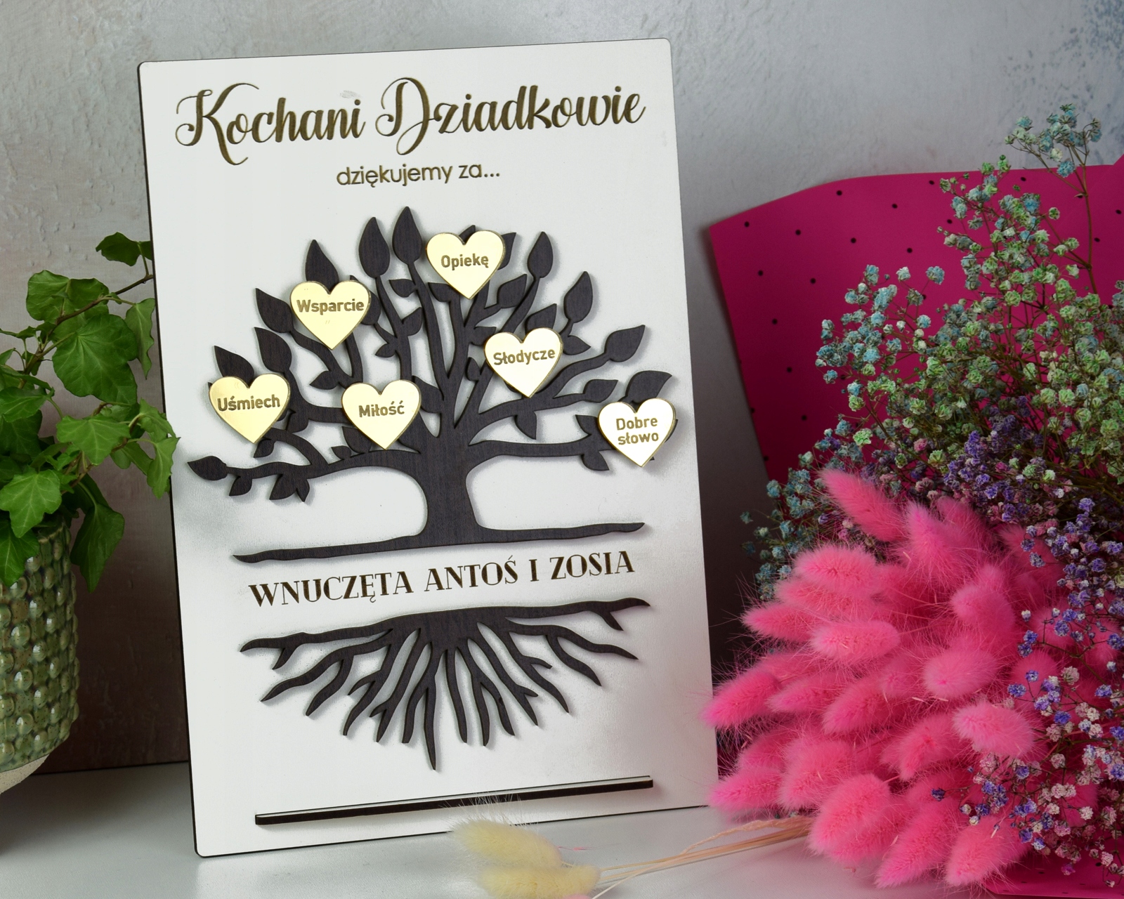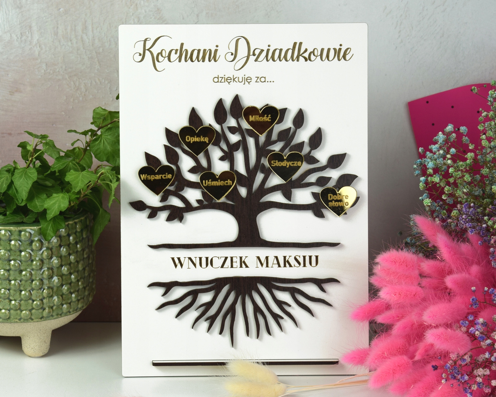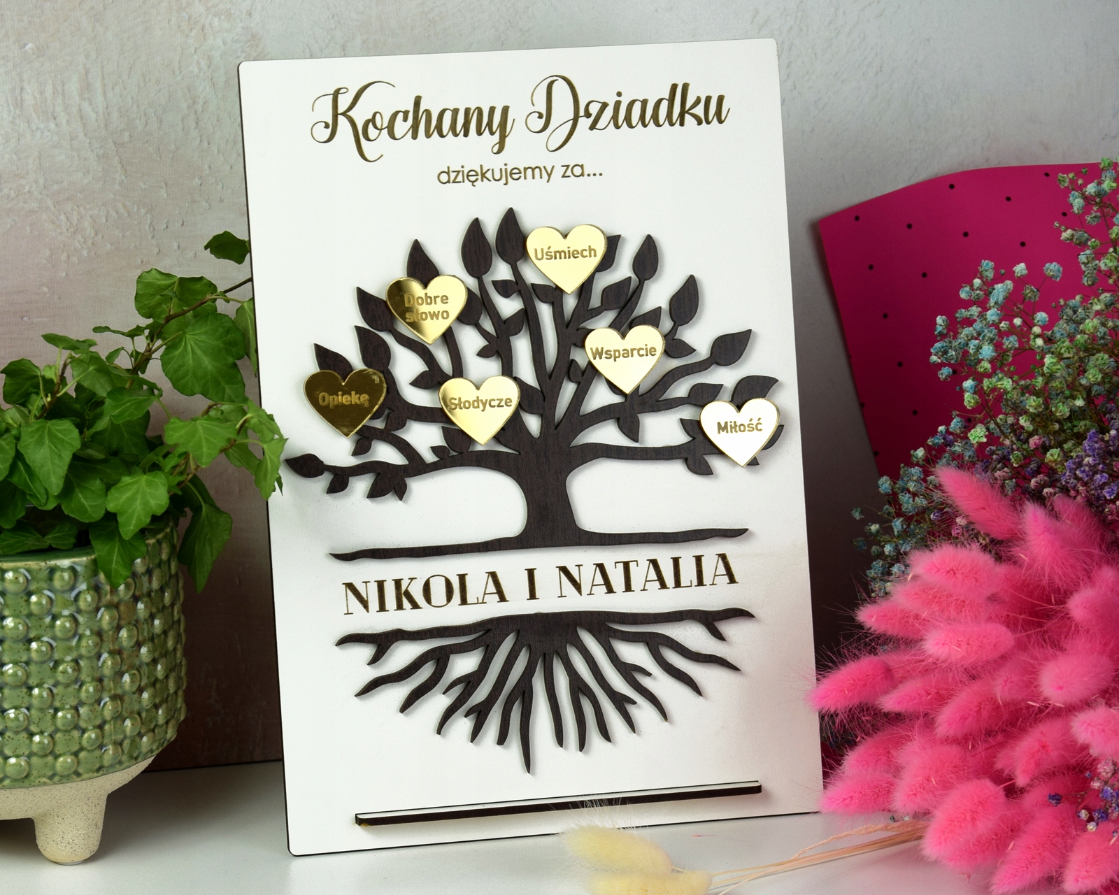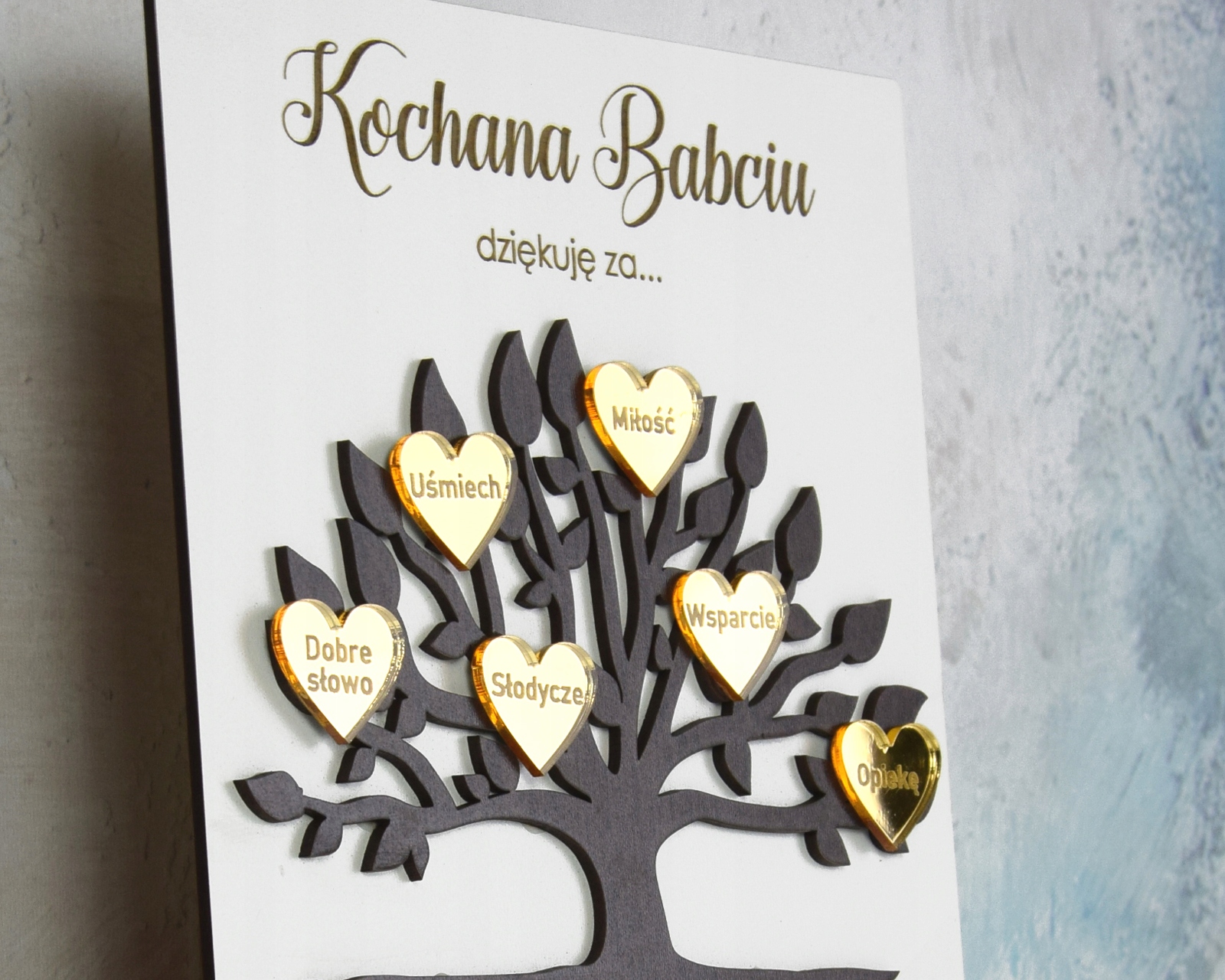 Картина выполнена из высококачественной плиты ХДФ белого цвета, дерево – из плиты цвета венге с наклеенными сердечками из золотого зеркального акрила. Все надписи выгравированы с помощью высококачественных лазеров.