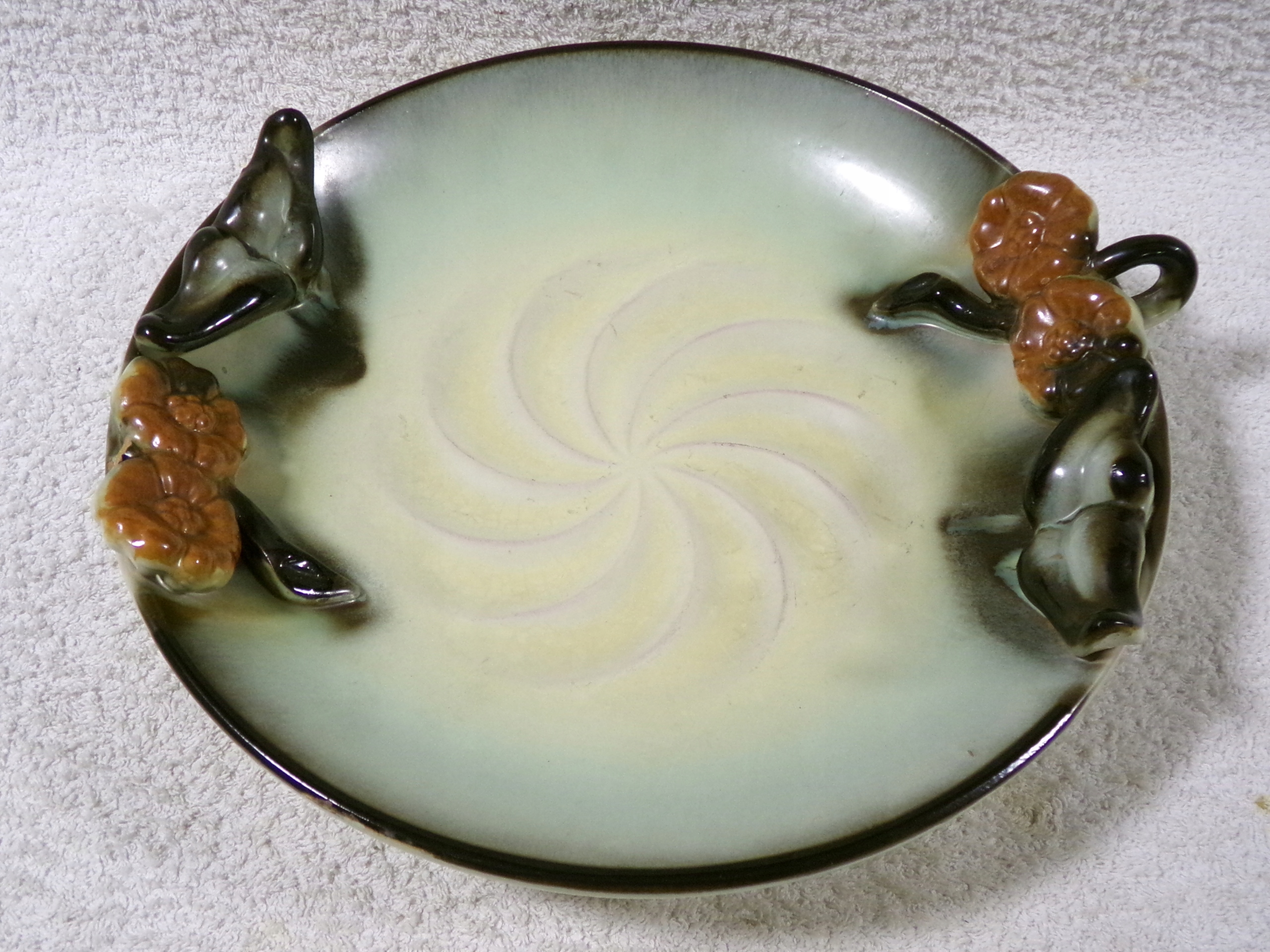 Красивая керамическая тарелка с центральным диаметром 29,5 см, высотой 7,5 см, весом 1,50 кг. В хорошем состоянии, отсутствует ручка на одной стороне.