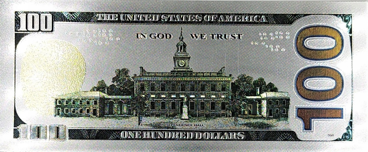 Доллар стал официальной денежной единицей США в 1785 году. Банкнота в 100 долларов — самое популярное платежное средство в США. В 2012 году на его долю приходилось 77% всей валюты в обращении. Представленный узор взят из проекта 2009 года. Первая банкнота такого достоинства была выпущена в 1862 году.