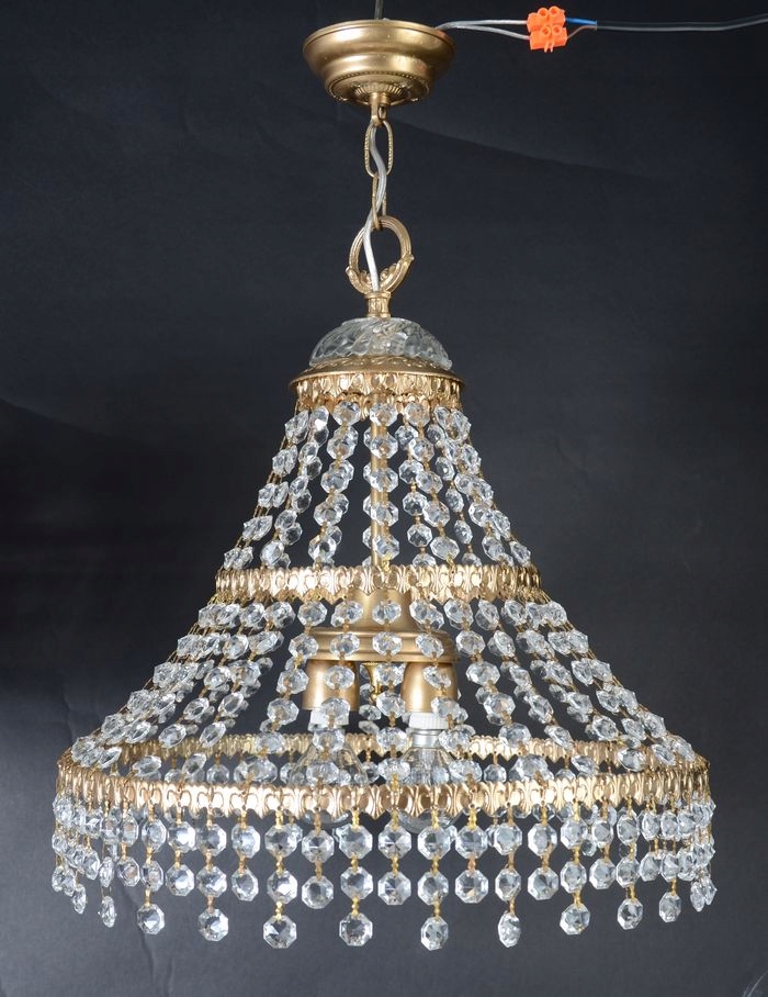 Чудесная люстра, богато украшенная кристаллами, родом из Испании 1960-х годов. Все металлические элементы конструкции выполнены из металла золотистого цвета. Каркас люстры состоит из двух колец, на которых подвешены прозрачные стеклянные кристаллы, которые красиво рассеивают свет – придавая помещению радужное сияние.
