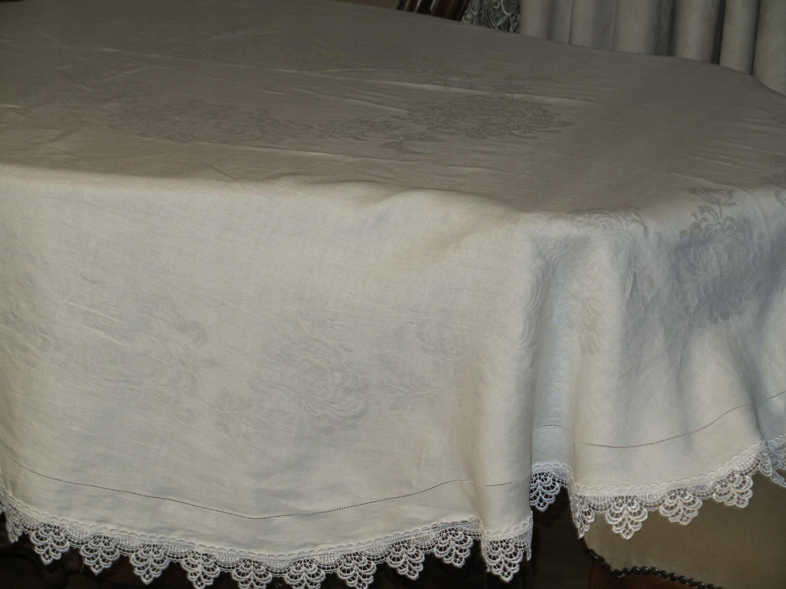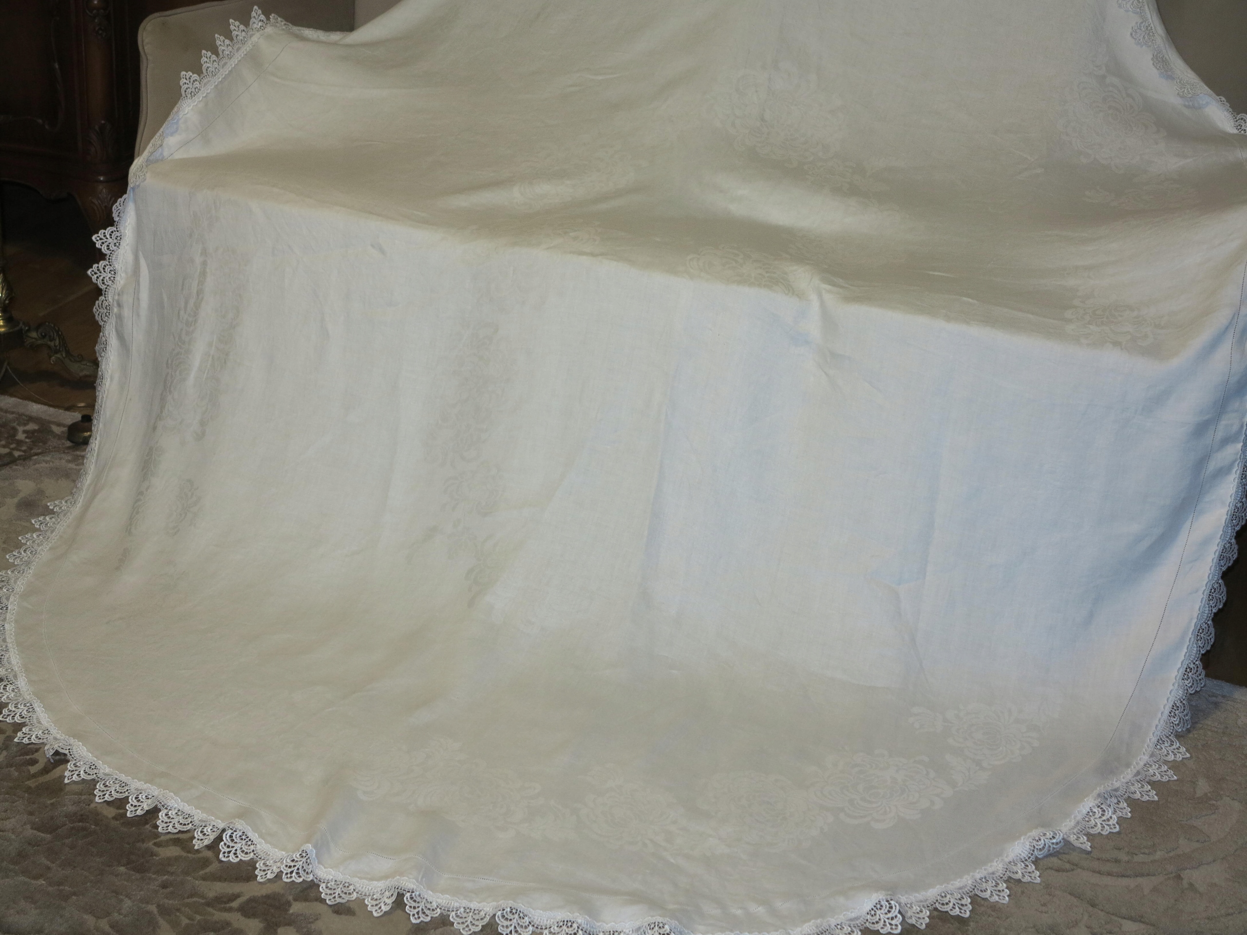 Предмет аукциона - красивая дамасская, льняная скатерть с мережкой и тиснением цветочного узора, декорированная вокруг гипюром. Размеры скатерти: длина 235см, ширина 183см. Скатерть б/у, в очень хорошем состоянии. Рекомендую, будет красивое украшение стола.