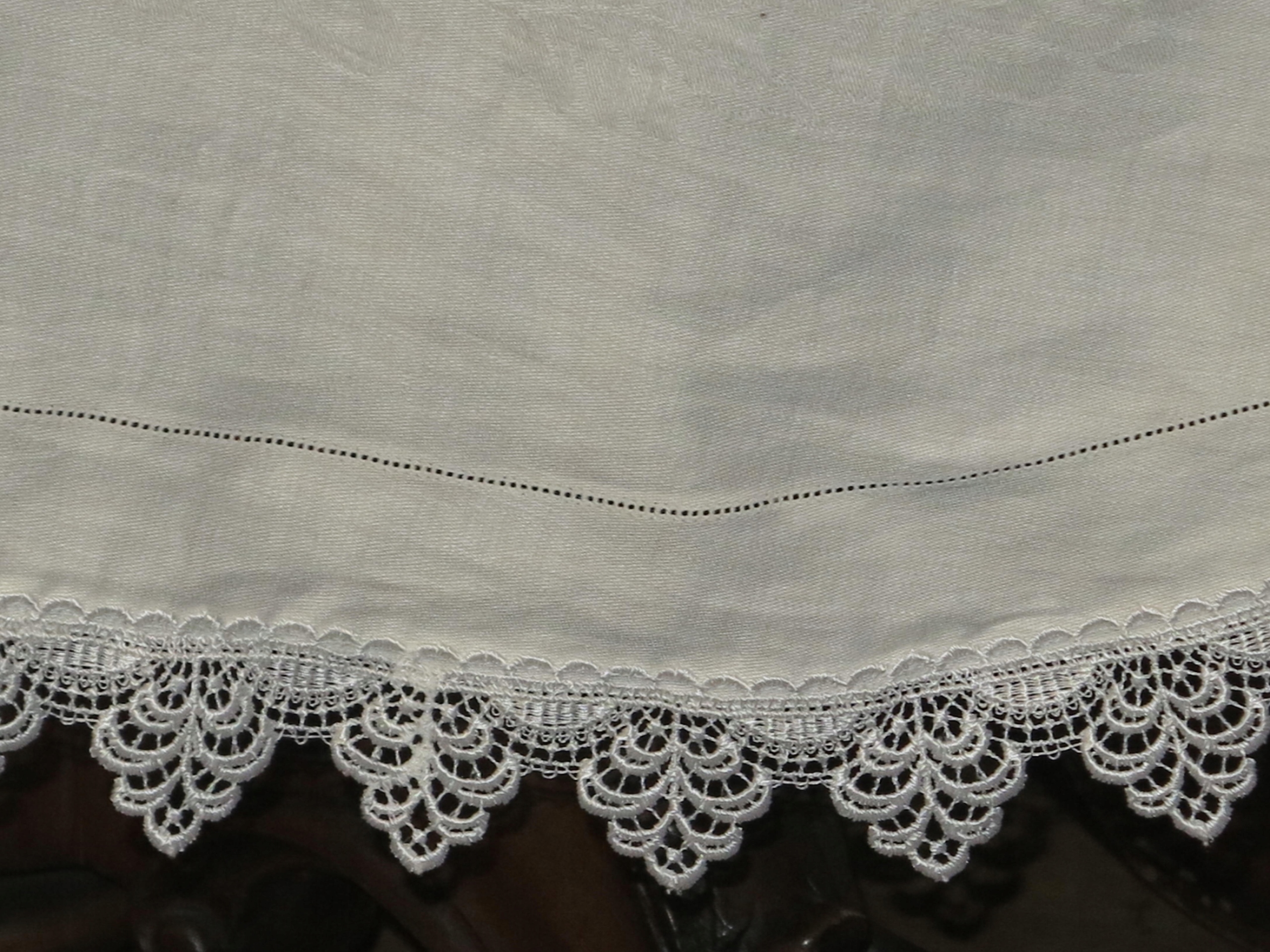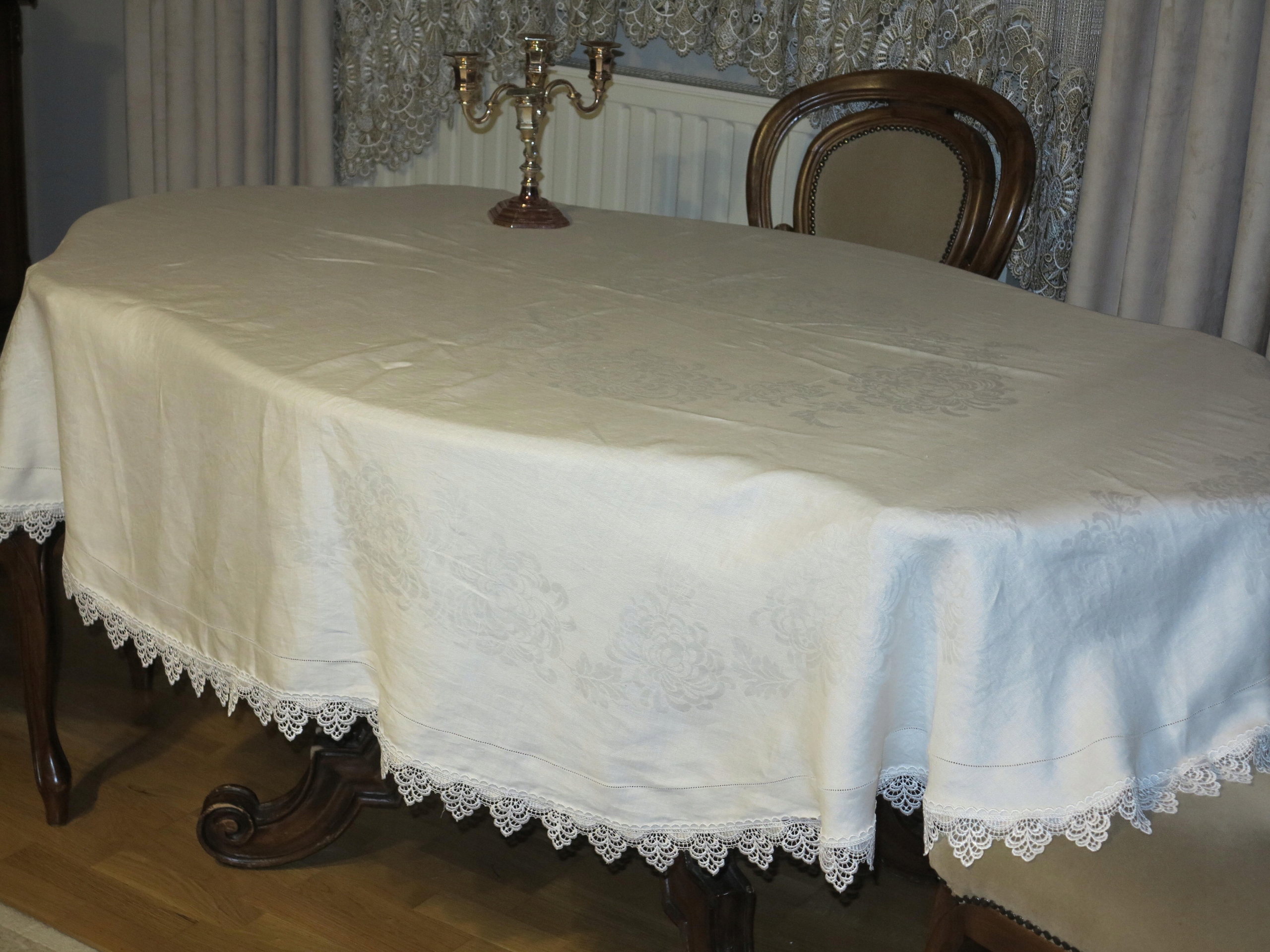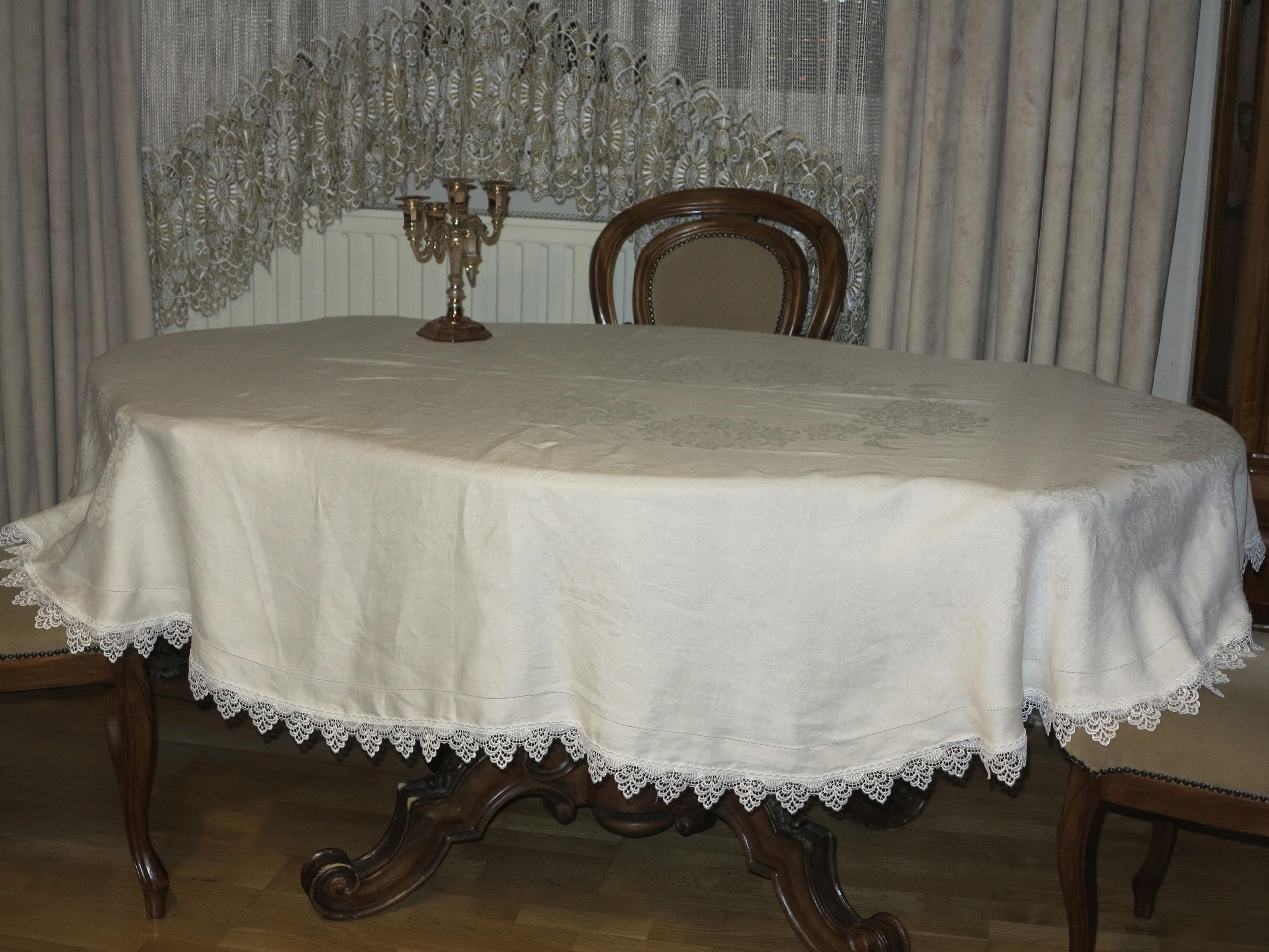 КРАСИВУЮ БОЛЬШУЮ ОВАЛЬНУЮ СКАТЕРТЬ ДЛЯ ПРИТВОРСТВЕННОГО СТОЛА. СКАТЕРТЬ ИЗ ЛЬНЯНОГО ДАДАМАСКА, С ЦВЕТОЧНЫМИ УЗОРАМИ И ФРАГМЕНТОМ С КАЙДЕРОМ. ВОКРУГ УКРАШЕН ГУИПУРКОЙ. ЦВЕТ КРЕМ БЕЛЫЙ