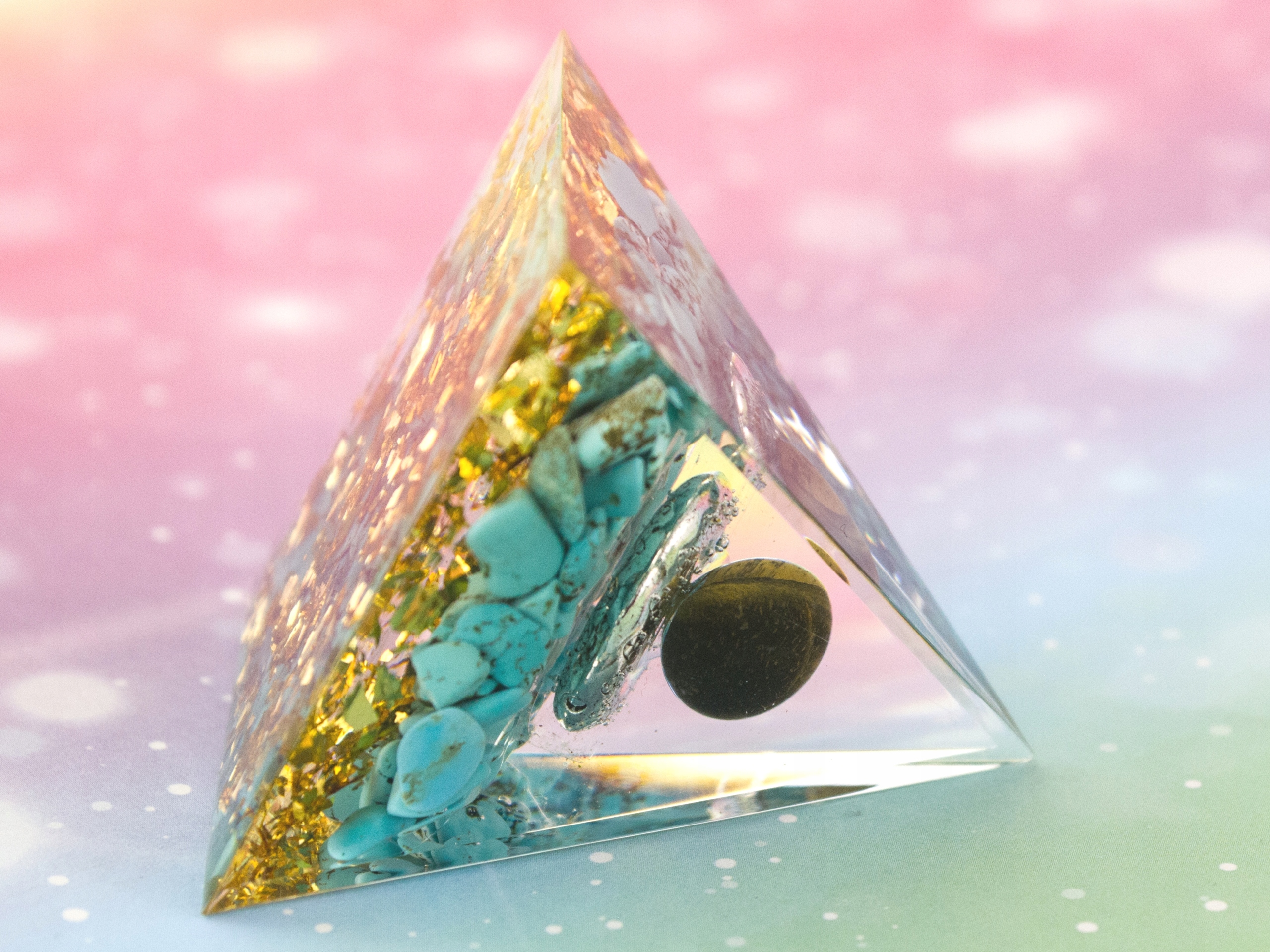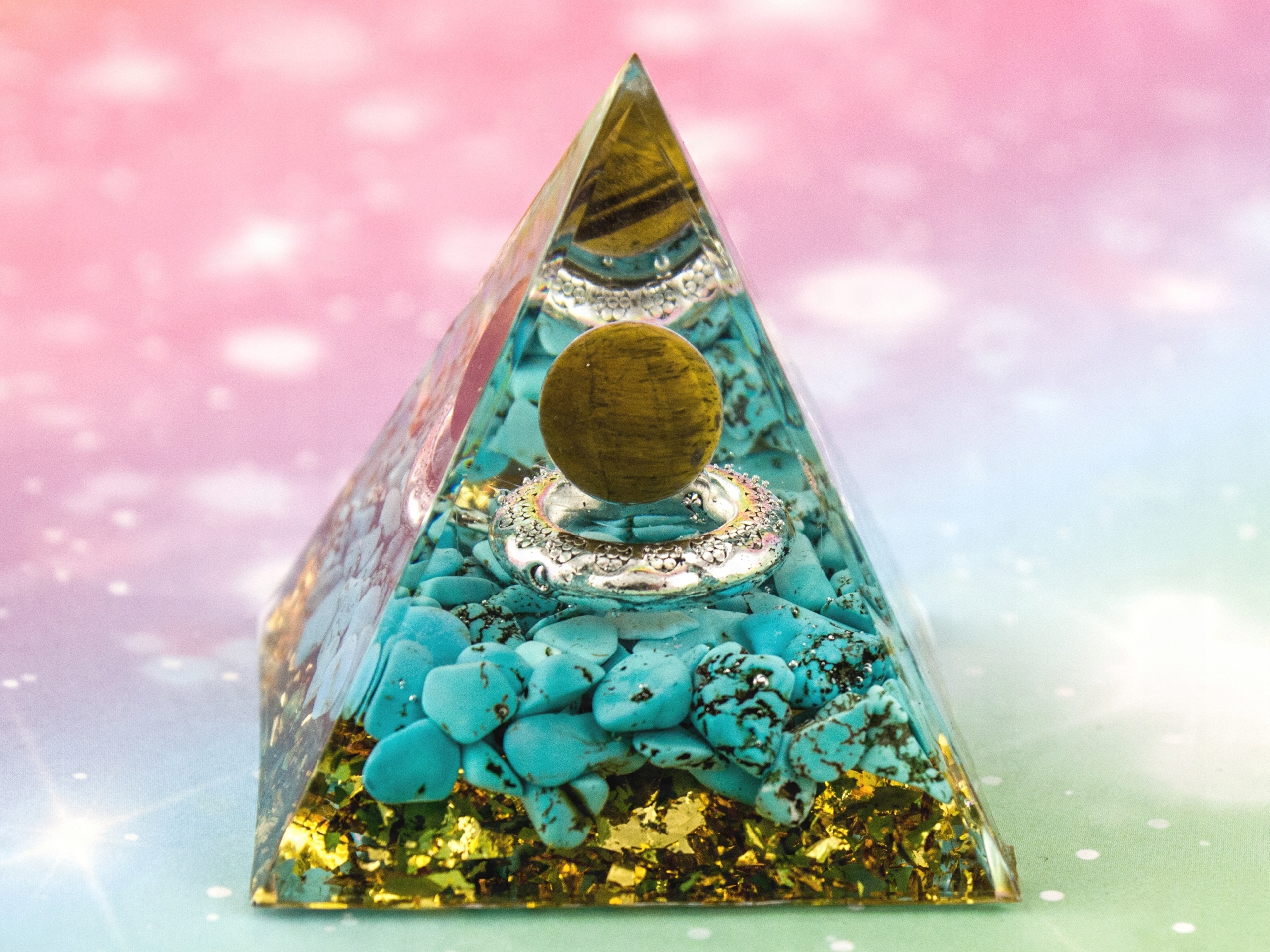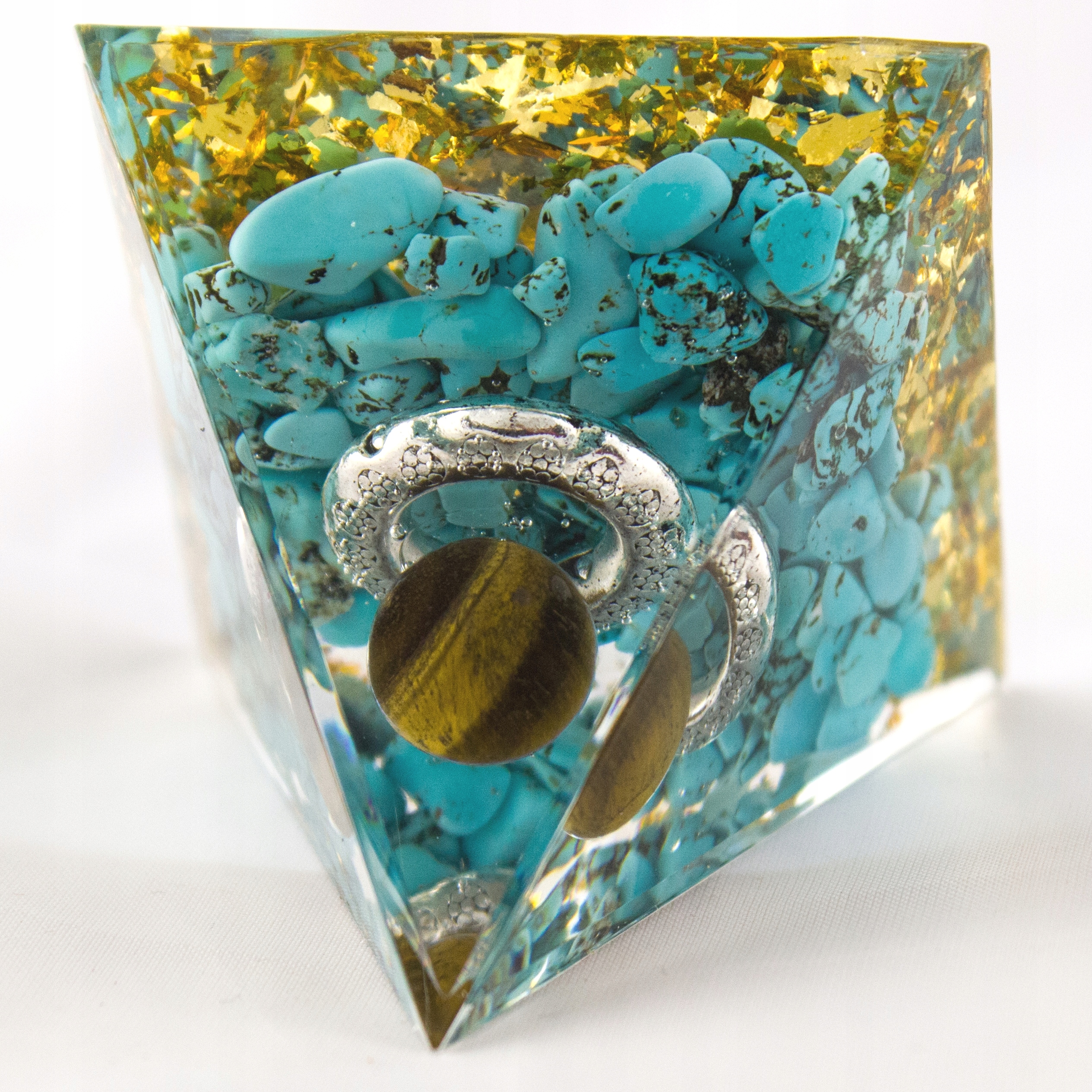 Красивая оргонитовая пирамидка - чудесная Бирюза, блестящая золотая фольга и шарик Тигровый Глаз, красивое украшение из натуральной смолы, имеющее необычный, приятный для глаз внешний вид, излучающее энергию, дарующую хорошее здоровье, нейтрализующую плохую энергетику, добавляющую душевное спокойствие и хорошее настроение.< /h2>