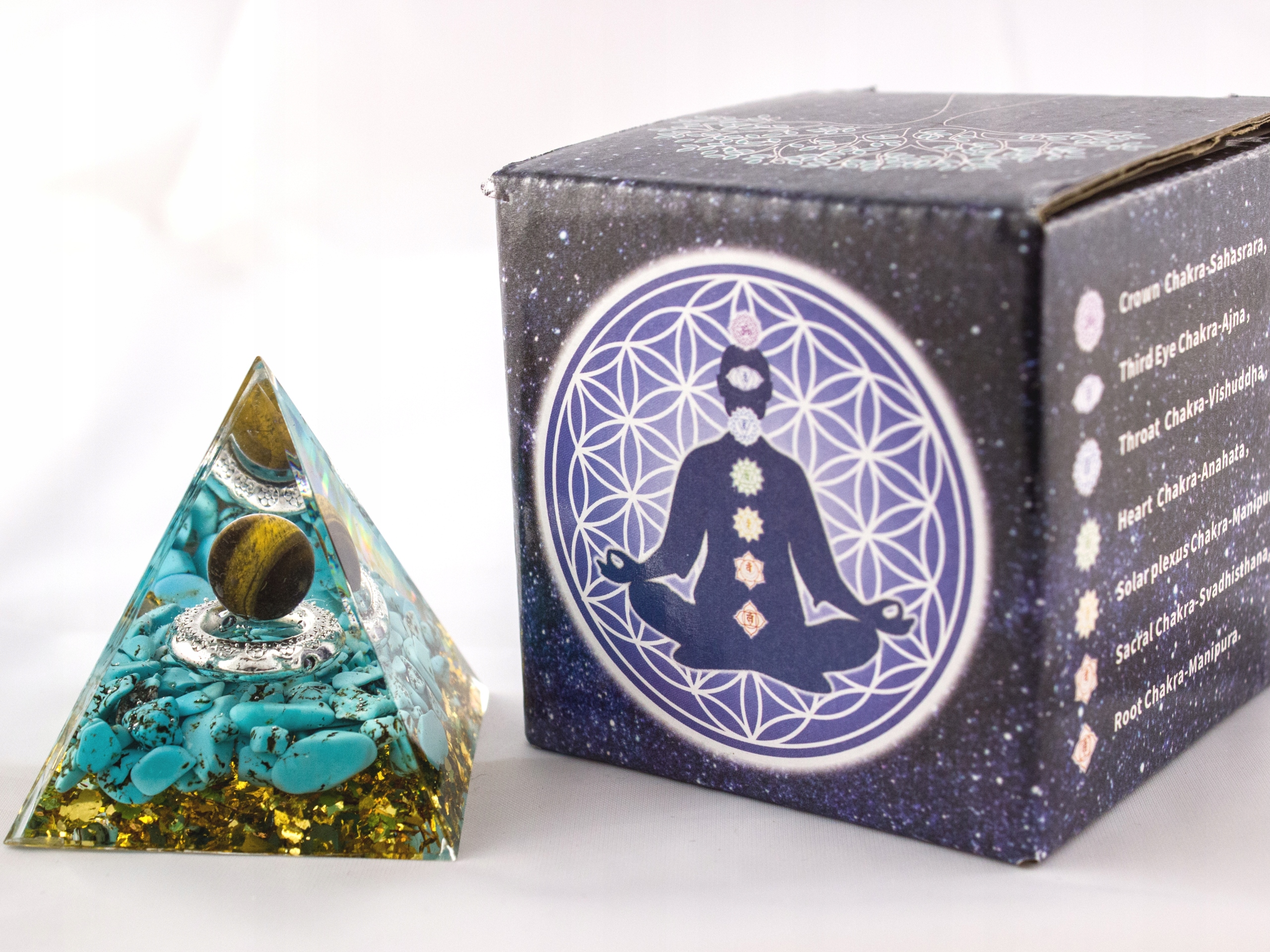 КРАСИВАЯ ОРГОНИТОВАЯ ПИРАМИДА БИРЮЗОВЫЙ ТИГРОВЫЙ ГЛАЗ КРАСИВЫЙ ПОДАРОК ГАРМОНИЯ 5см