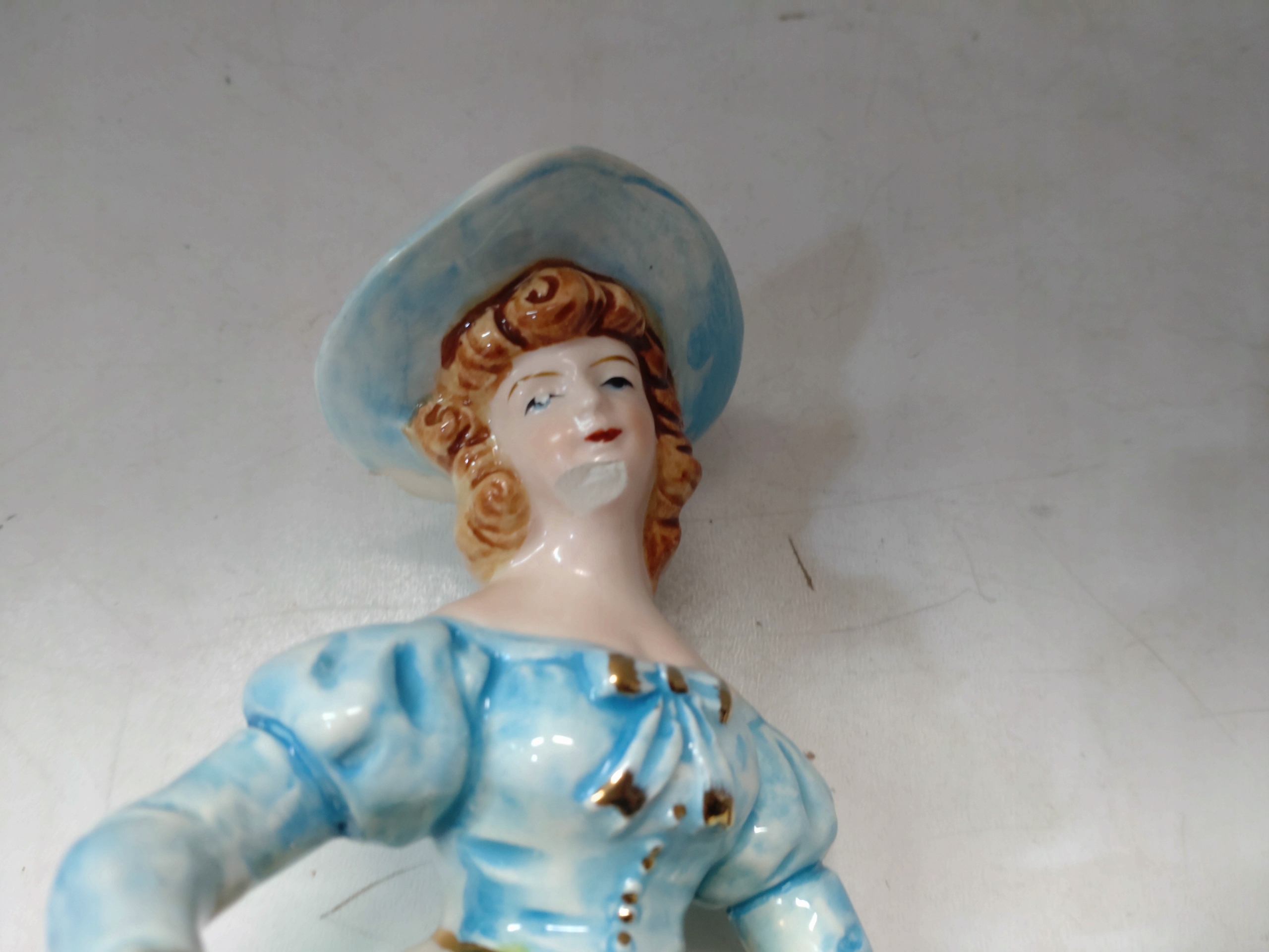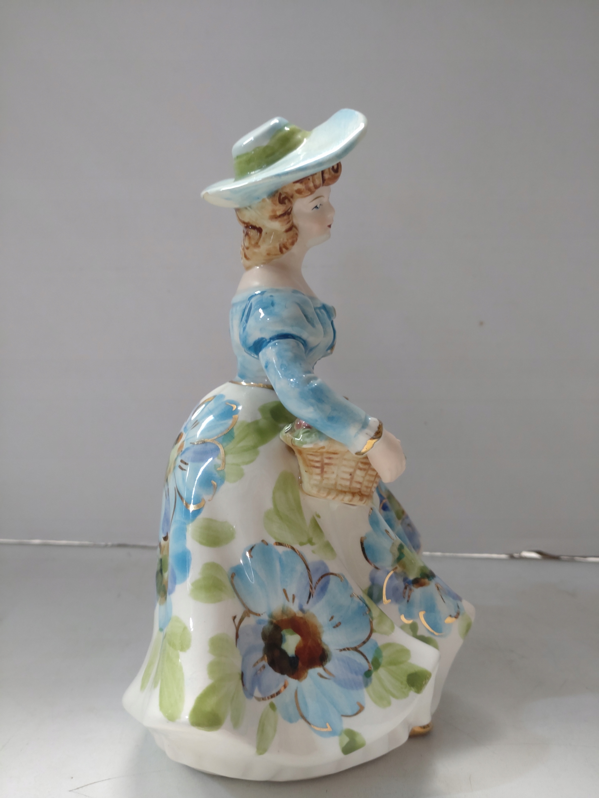 Красивая фигурная фигурки фарфора в шляпе с корзиной в цветочном платье