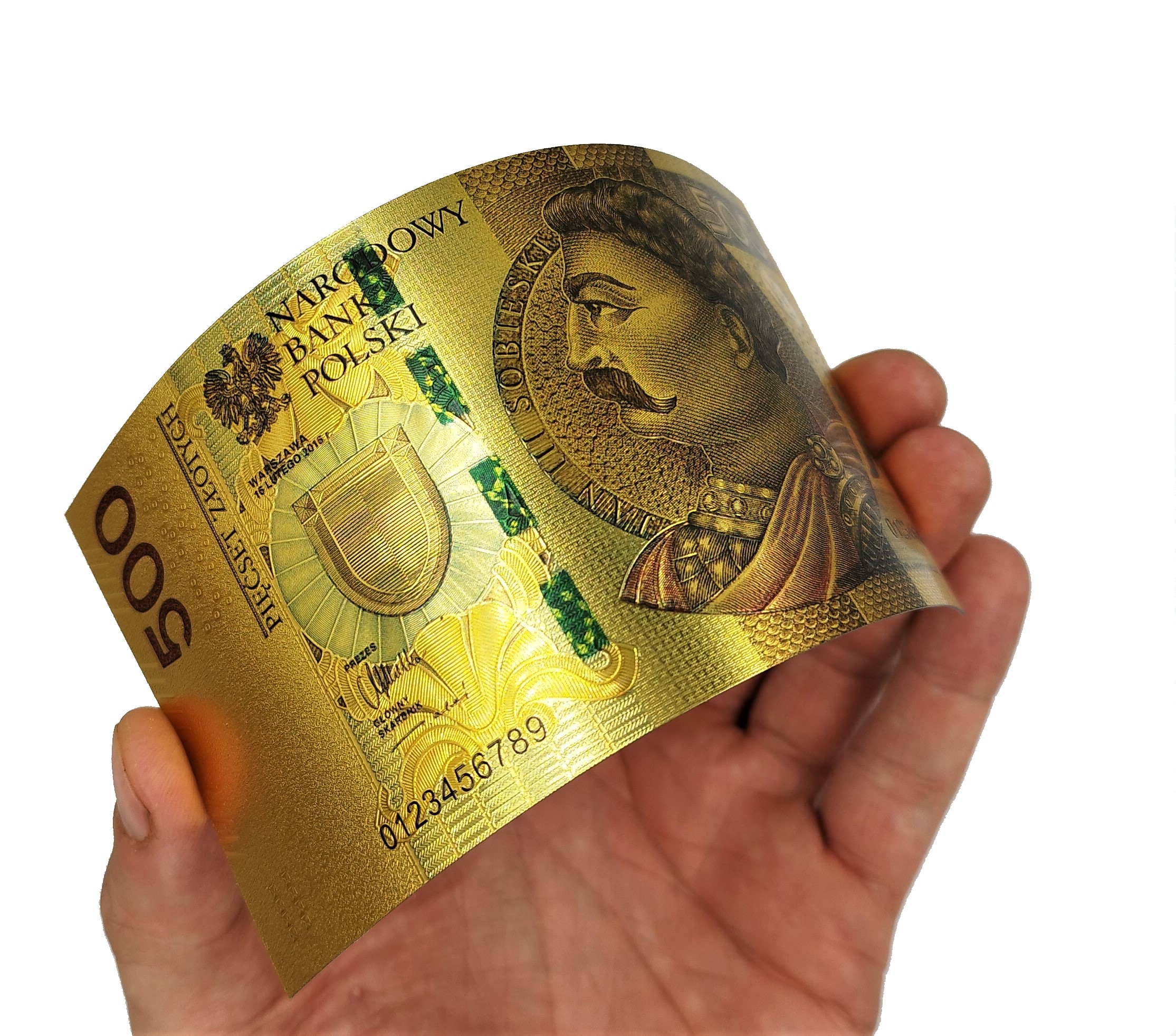 Точная копия банкноты польского обращения самого высокого номинала, изготовленная из ПВХ и покрыт цветной золотой фольгой.