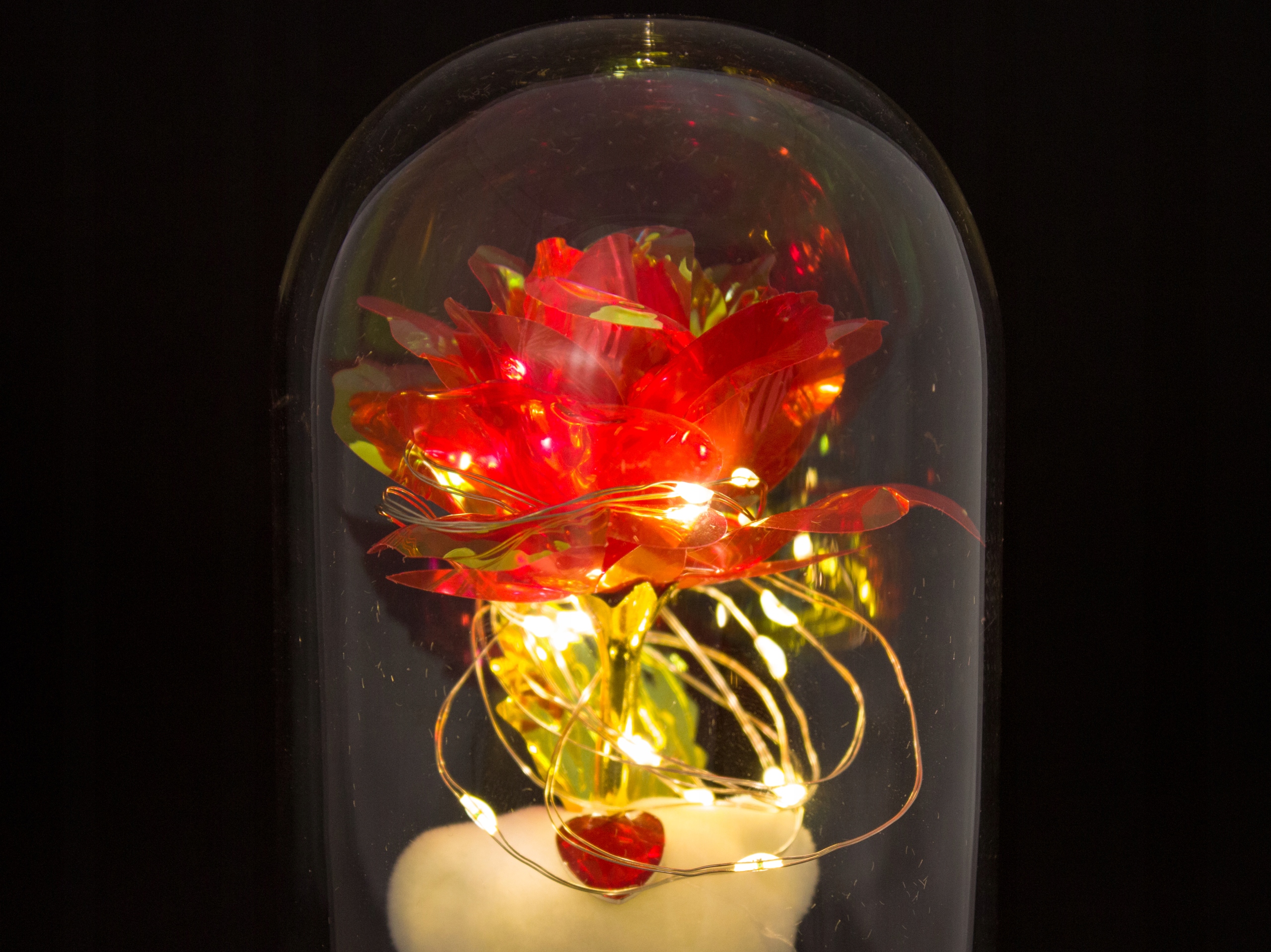 Эта точно изготовленная роза, символ любовь была помещена в красивый стеклянный купол, сквозь который ее красоту можно увидеть постоянно, даже в темноте, поскольку он освещен 20 светодиодными фонарями, окружающими его.
