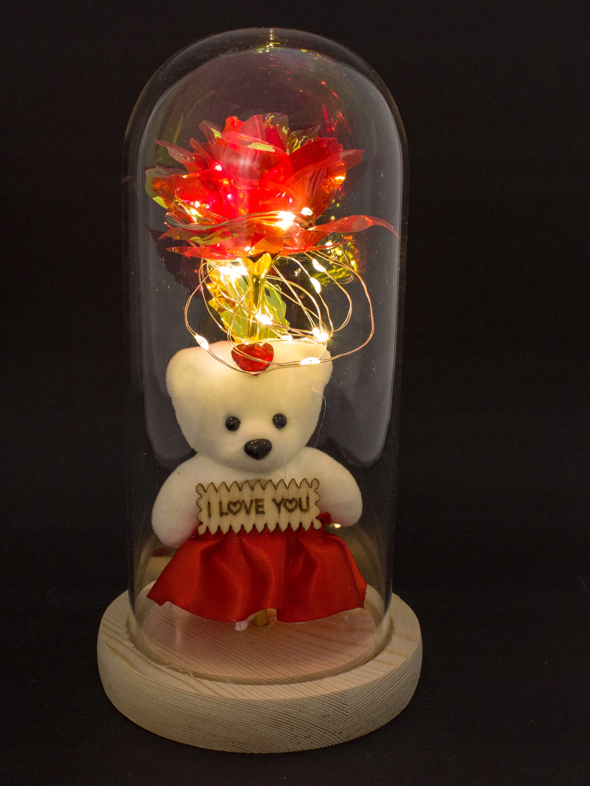 КРАСИВА ШТУЧНА ВІЧНА ТРОЯНДА У СКЛЯНОМУ СВІТОДІОДНОМУ КУПОЛІ З ВЕДМЕДКОМ І LOVE YOU BATTERYS