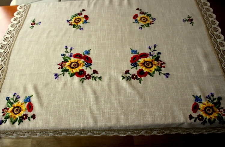 Красивая скатерть -Большая ручная вышивка подсолнечника, маки, розовые фрукты 125/150см