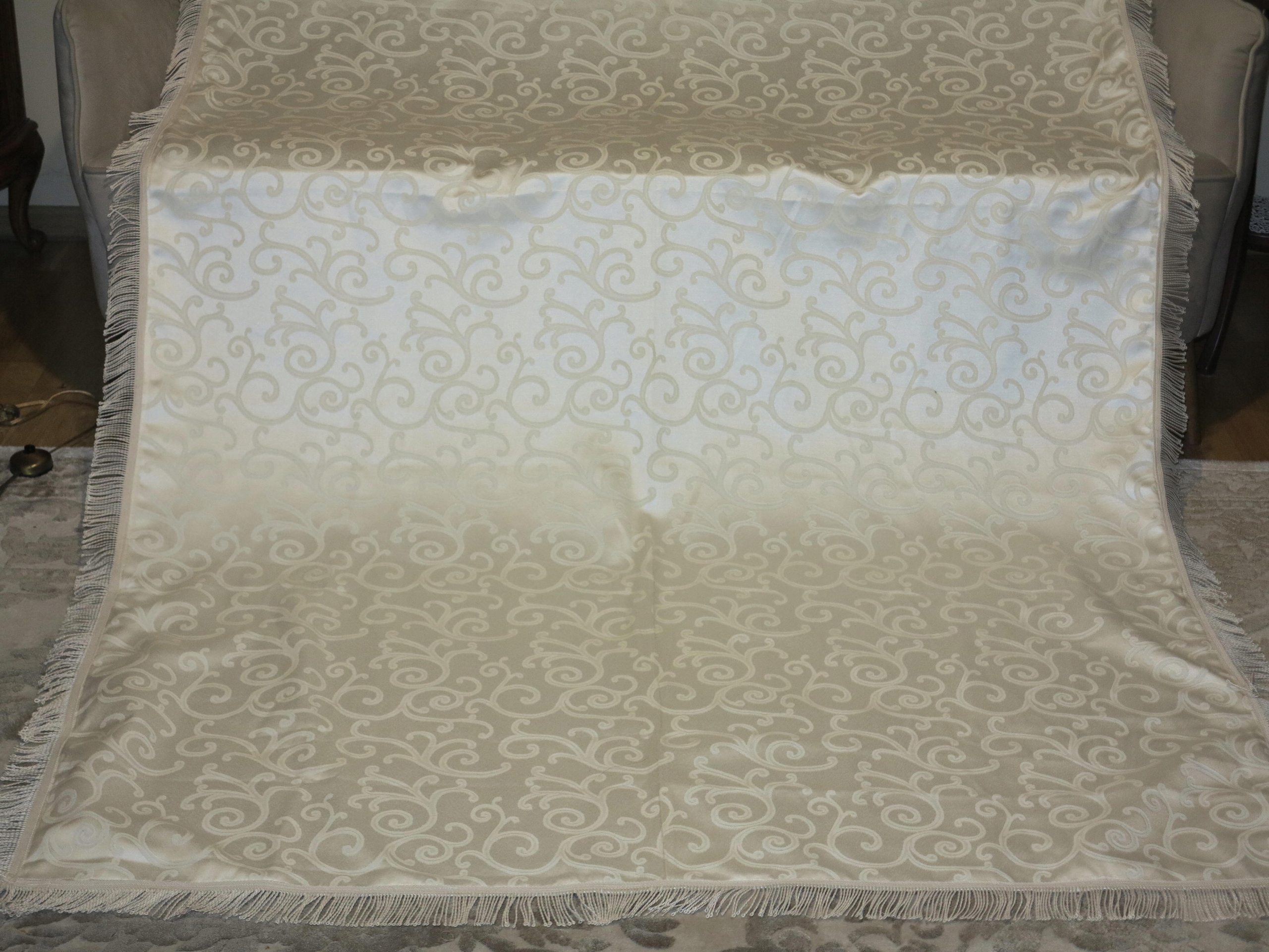 Предмет аукциона – чрезвычайно красивая скатерть, отделанная бахромой по периметру. Размеры скатерти: длина 242 см, ширина 144 см + бахрома длиной примерно 5 см. Скатерть б/у, но в отличном состоянии и качестве. Рекомендую, будет красивое украшение стола.