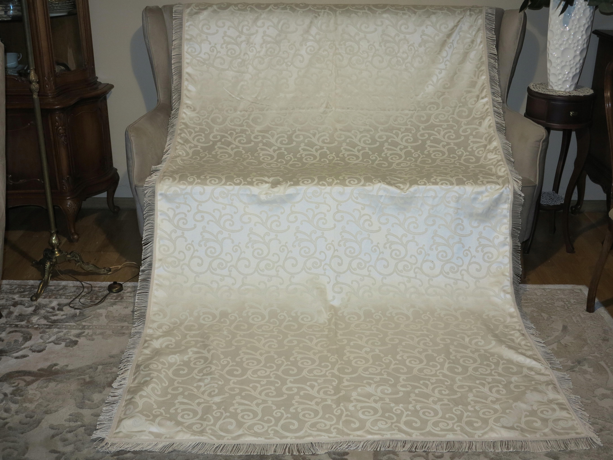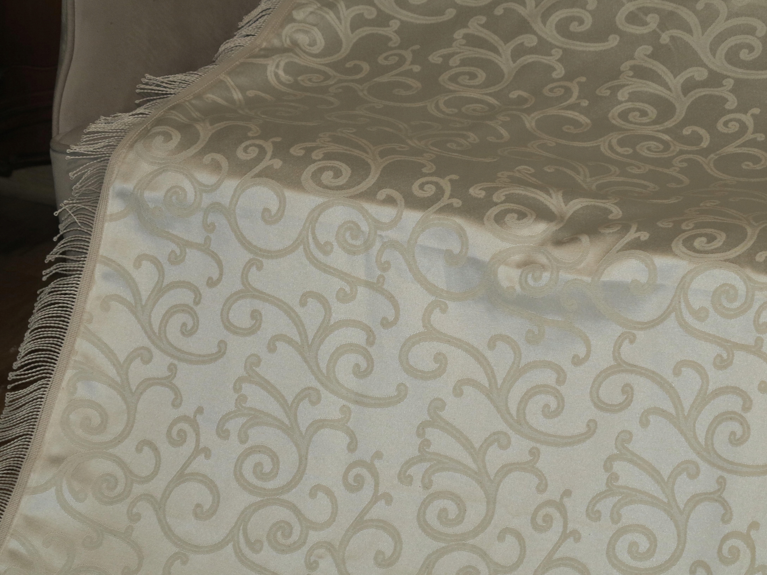 КРАСИВУЮ, ОГРОМНУЮ СКАСТОЧКУ ЭКрю, ИЗ ЖАКАРДОВОЙ ТКАНИ, ПРЕИМУЩЕСТВЕННО ХЛОПКА, ОЧЕНЬ ПРОЧНУЮ, ПЛОТНУЮ, ВЫСОЧАЙШЕГО КАЧЕСТВА. ШТАМПАННЫЙ СТИЛЬНЫЙ УЗОР. ЖЕМЧУЖНО-ЭКРУ ФОН, МАТОВЫЕ УЗОРЫ