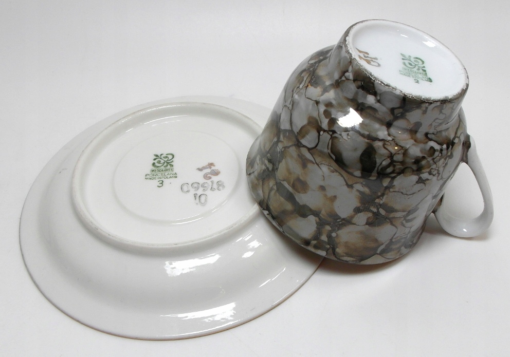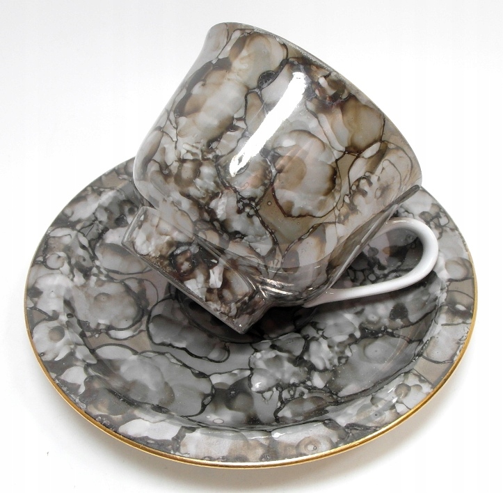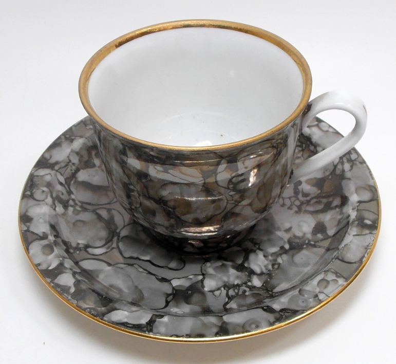 Предмет аукциона — красивая старинная чашка для эспрессо или маленькое черное платье. Белый фарфор с мраморным узором.