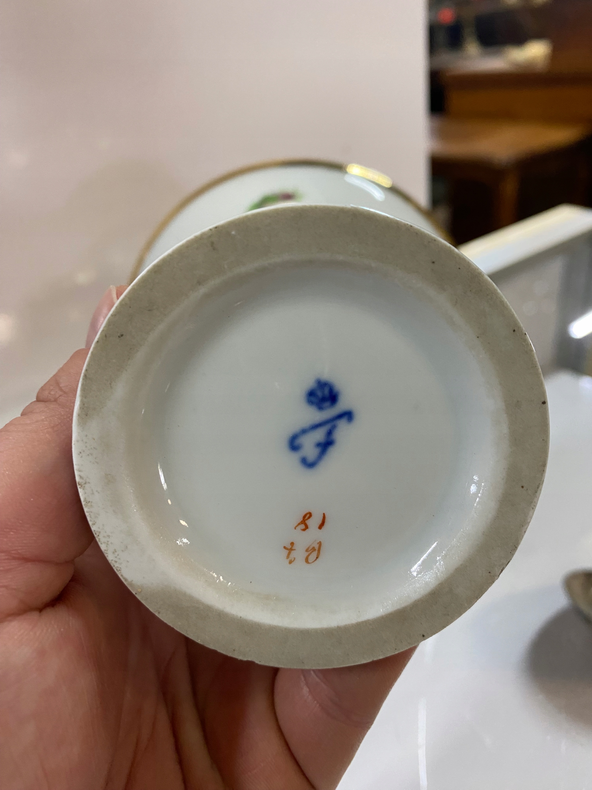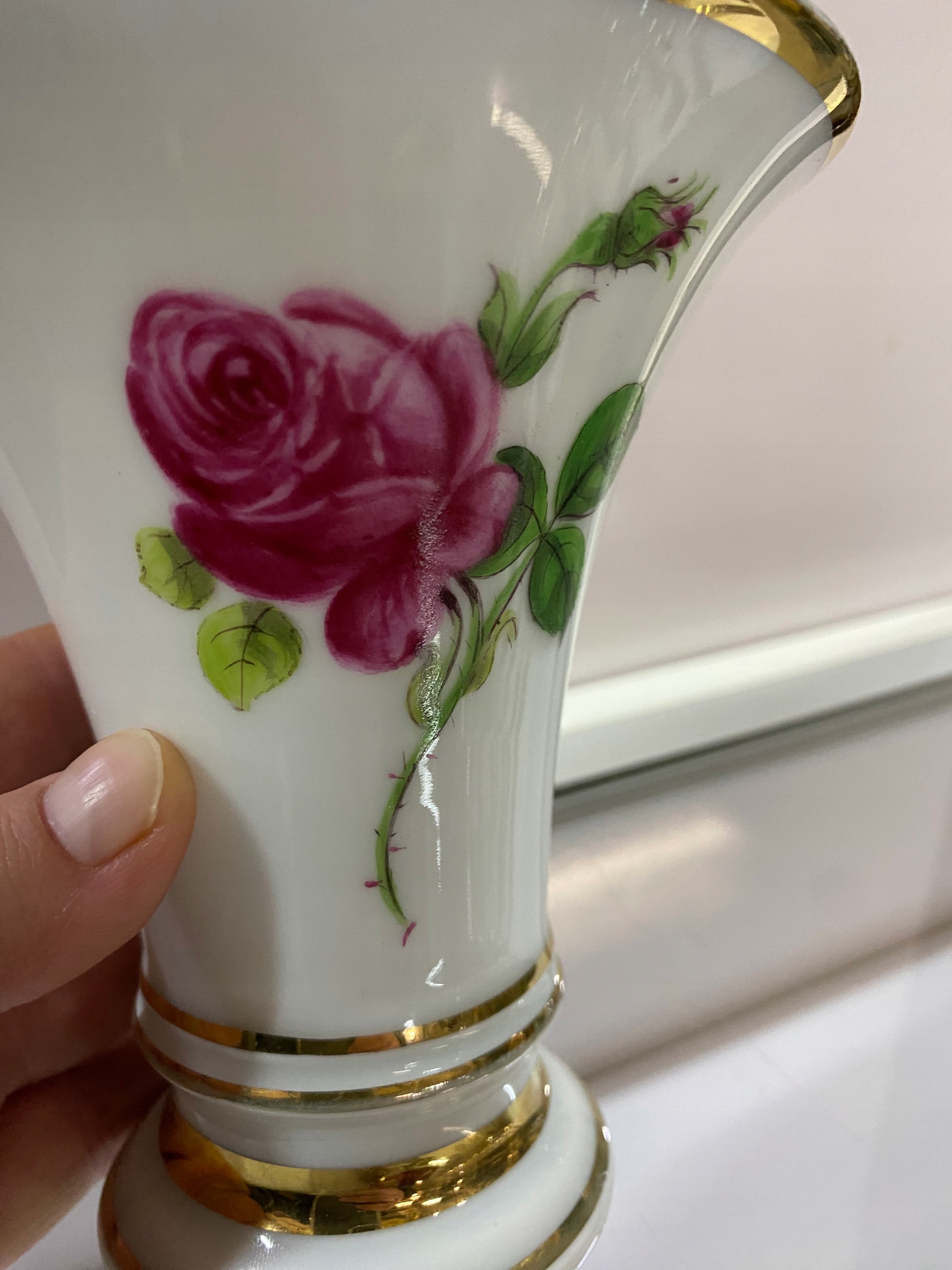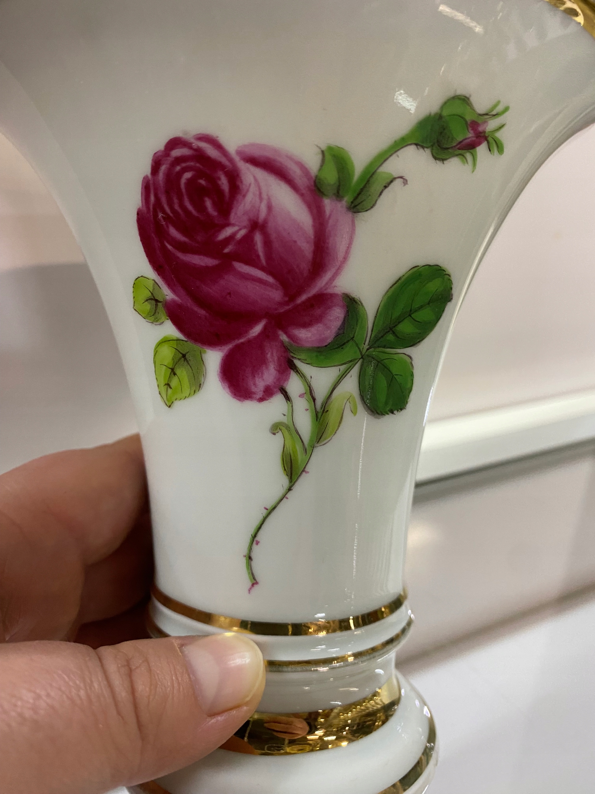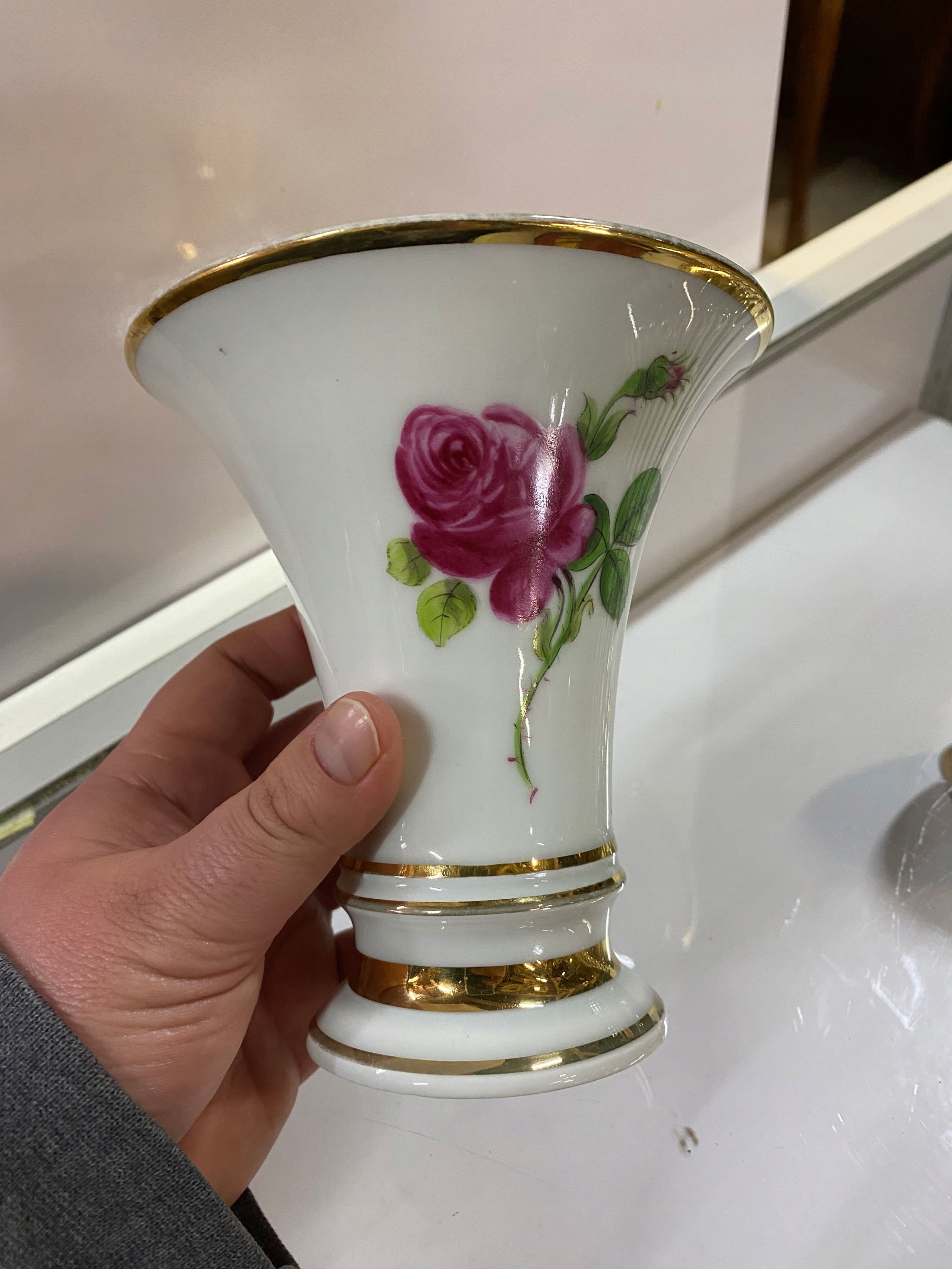 Продается красивая ваза Фюрстенберг с розой 1930-х годов. Видимые следы использования, такие как потертое золото или царапины. К сожалению, внизу имеются две вмятины, которые показаны на фотографиях. Несмотря на эти повреждения, он по-прежнему выглядит великолепно. Высота примерно 12,5-13 см. Диаметр около 12 см.