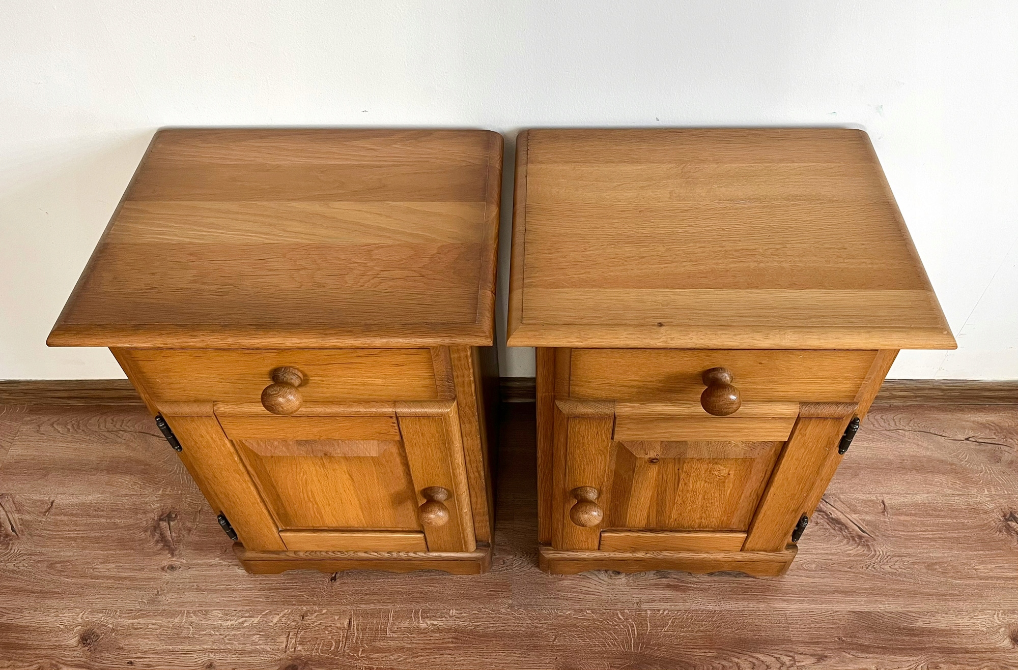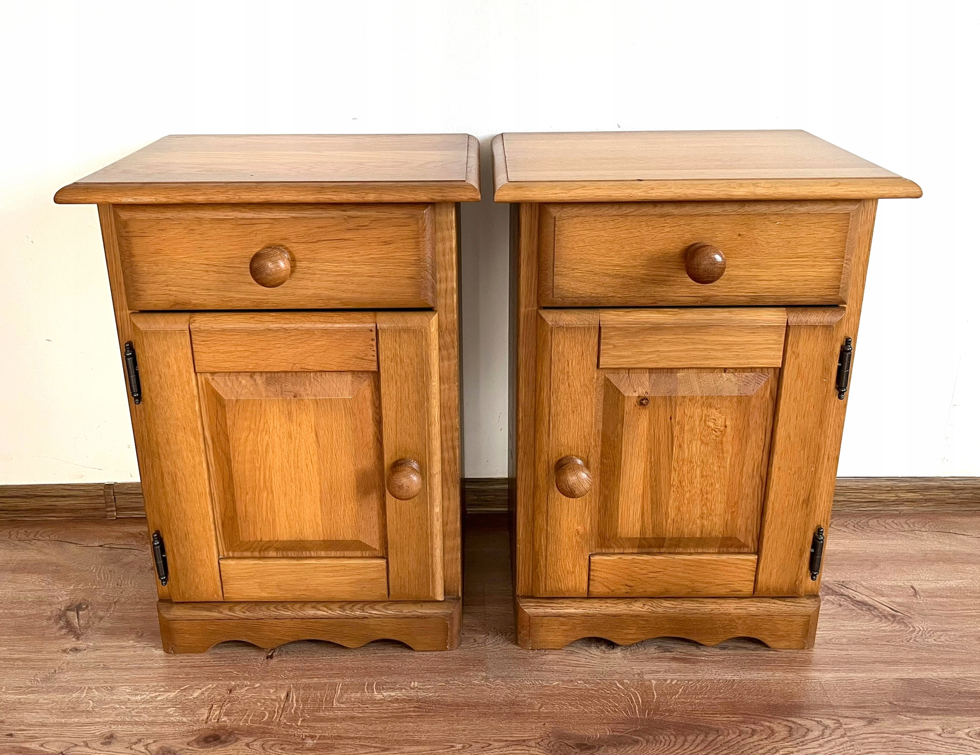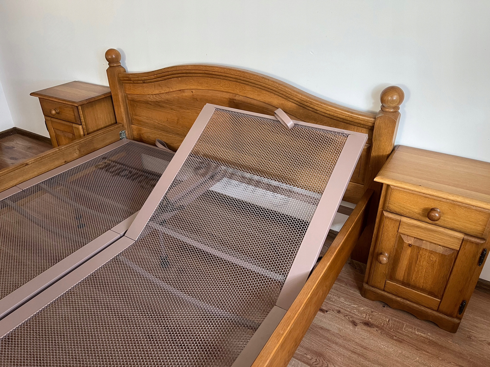 Очень массивный дубовый гарнитур, кровать с оригинальным регулируемым каркасом и 2 прикроватные тумбочки.