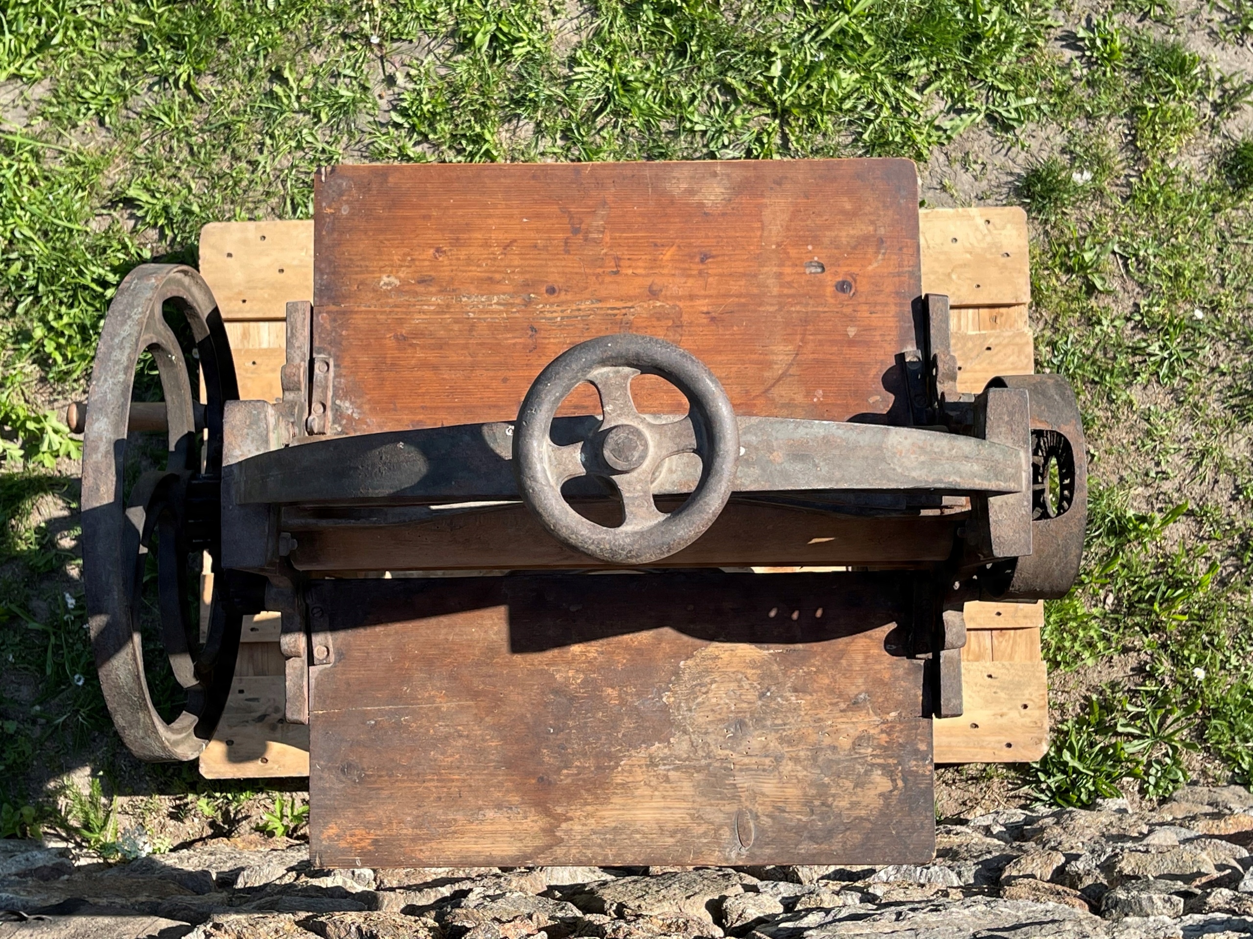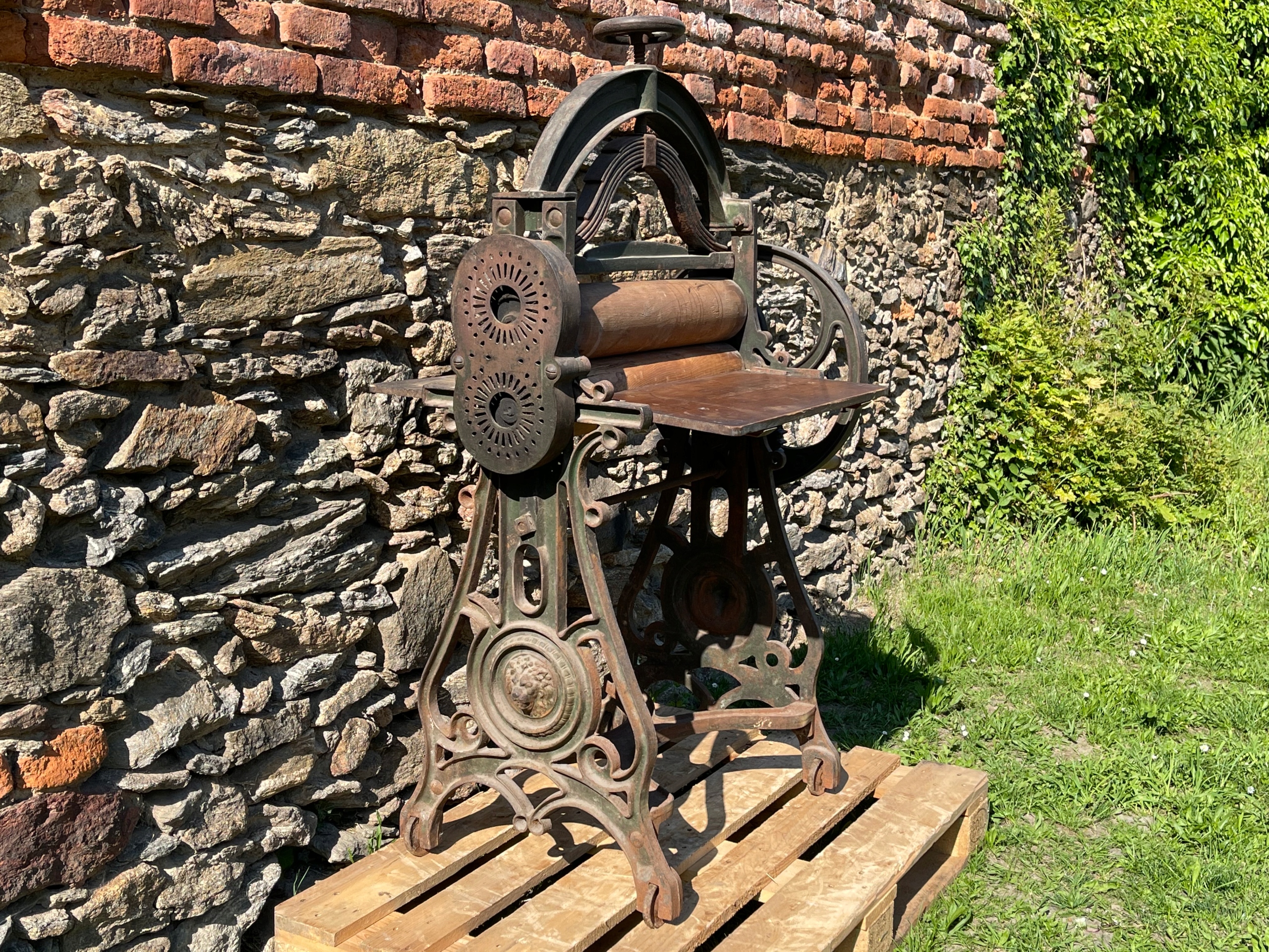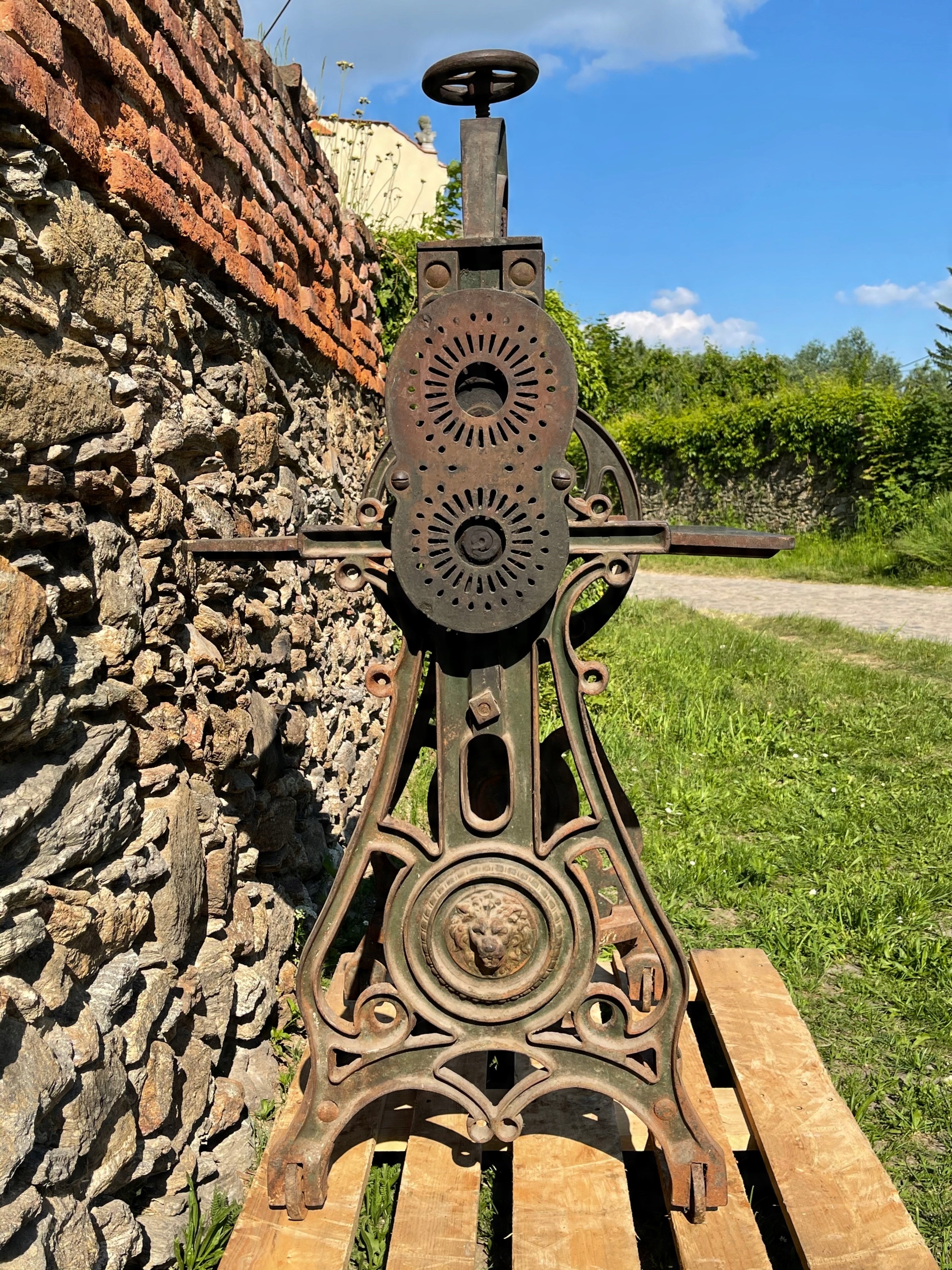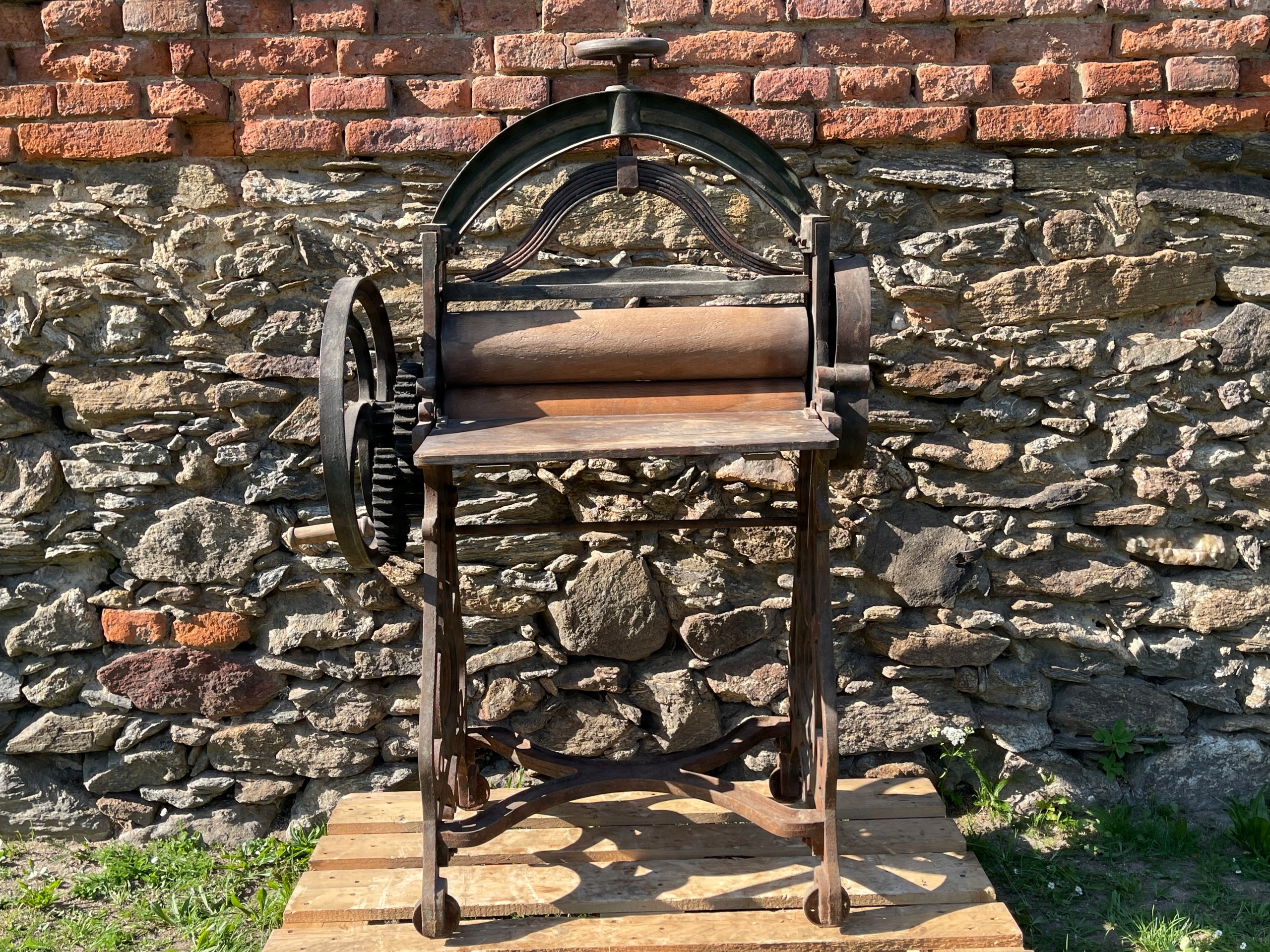 Предмет продажи — старый чугунный мангал довоенной эпохи. Очень красивый, менее распространенный узор со львами по бокам. Гладильная машина исправна, механизм работает исправно. Ранняя модель с квадратными гайками.