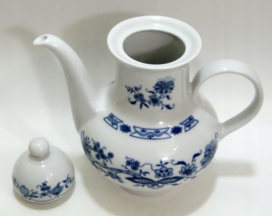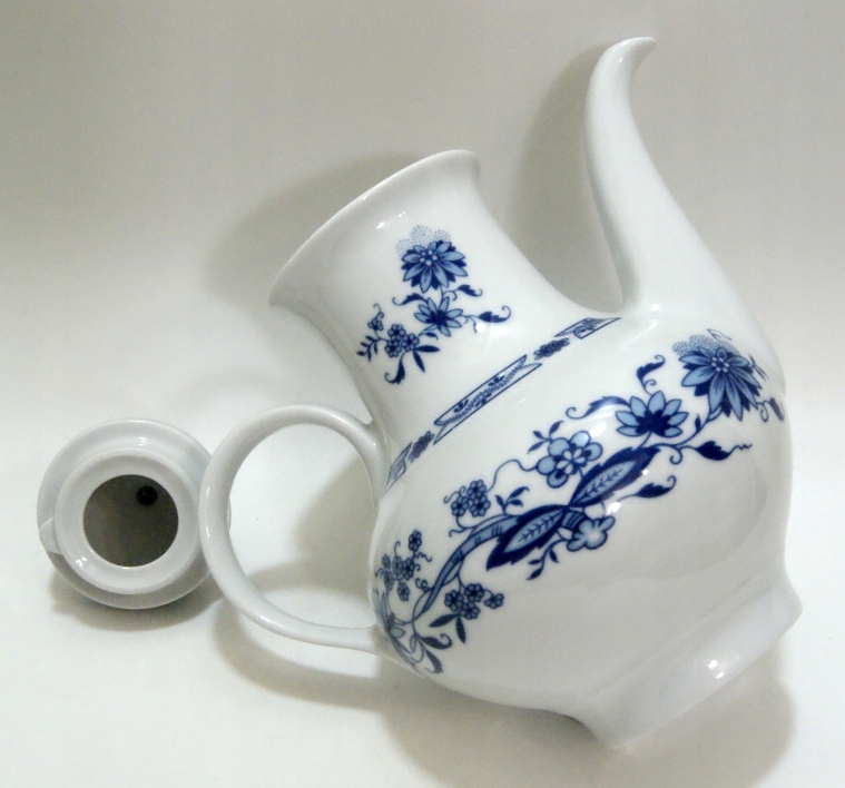 Кувшин изготовлен из белого фарфора, украшен узором из кобальтово-синего лука.