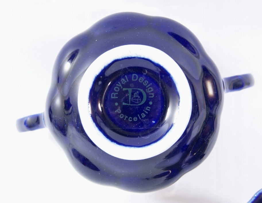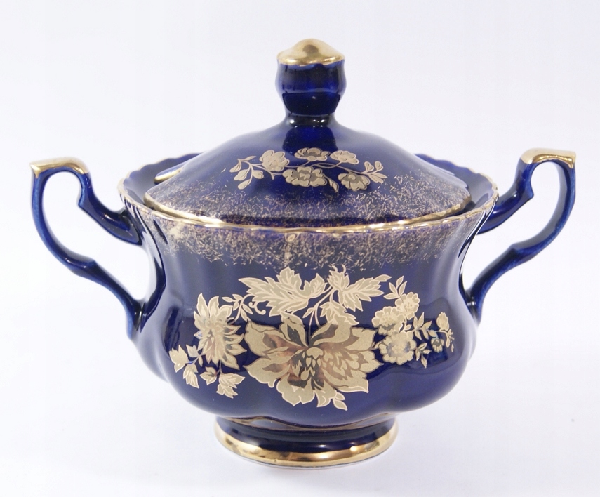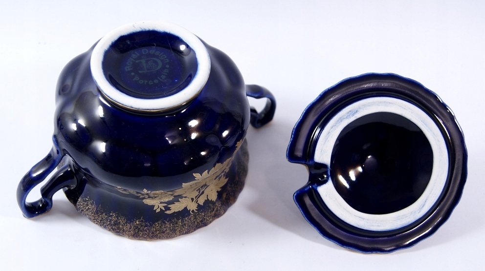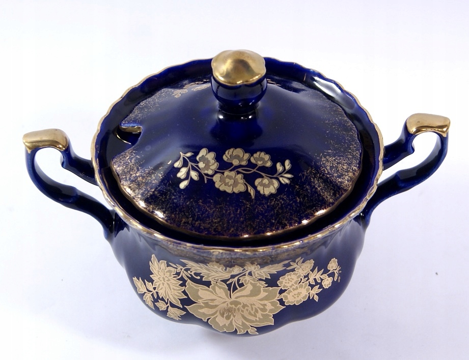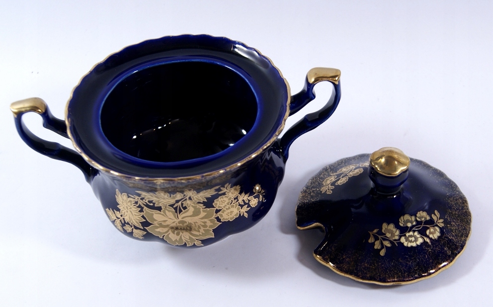Сахарная чаша изготовлена из фарфора в кобальте, украшенном тонким облегчением и золотистыми цветами с обеих сторон.