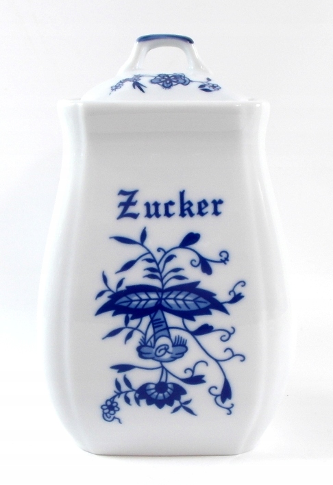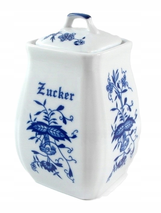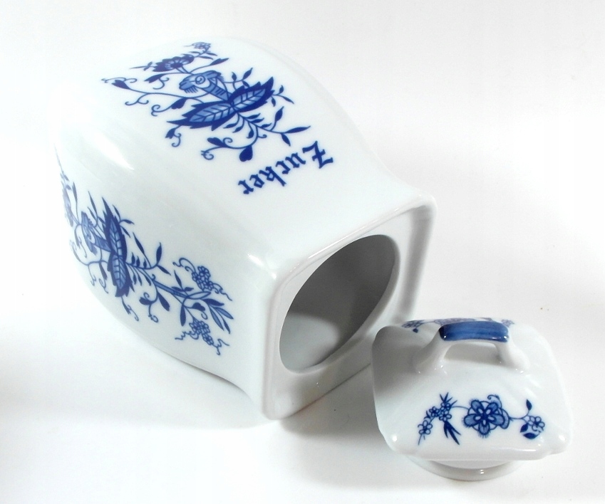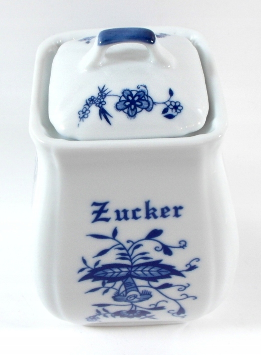 Красивый сахарный контейнер, он изготовлен из белого фарфора, украшенного кобальтовым луком.