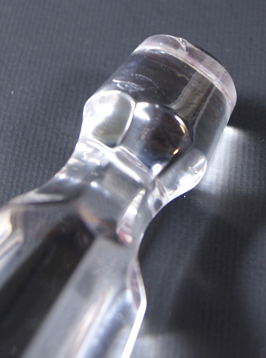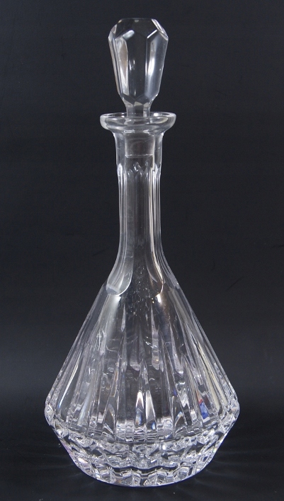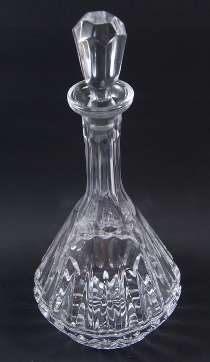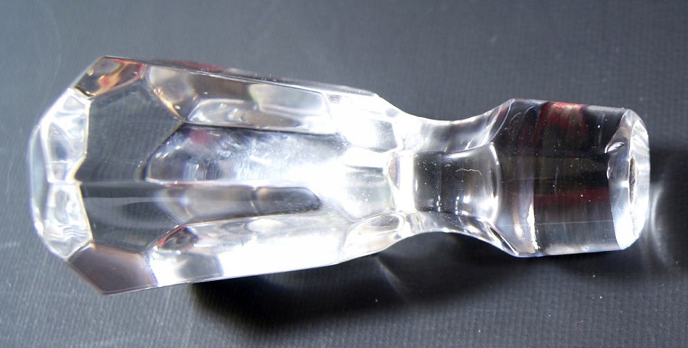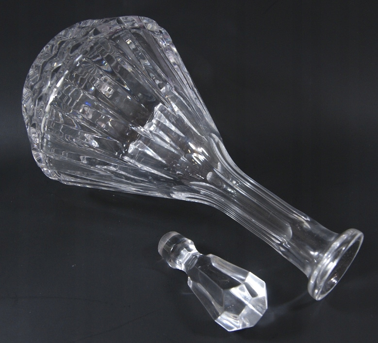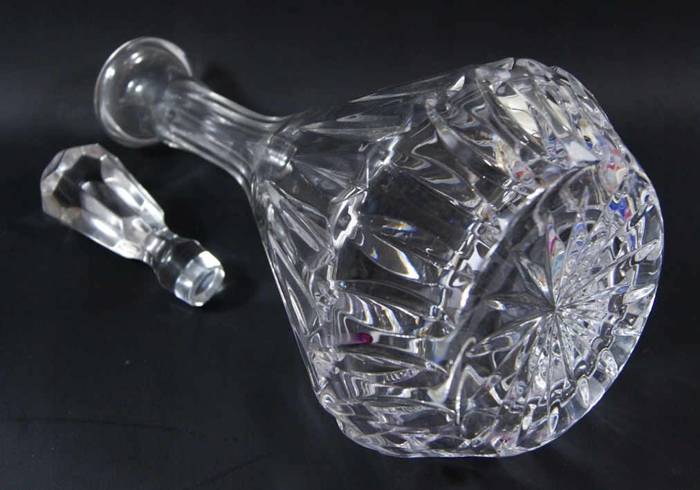 Красивый старинный графин, выполненный из толстого бесцветного хрустального стекла отличного качества, цельная пробка. Имеется небольшой производственный дефект в нижней части пробки - последние два фото.