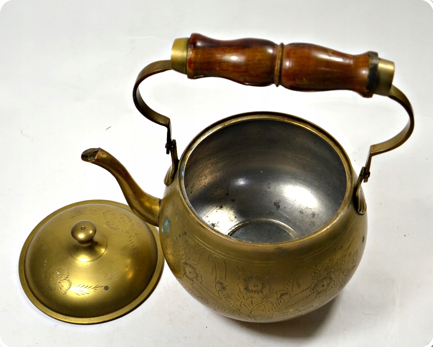 Выполнен из металла и покрыт медью - на чаше виден рельефный узор. Деревянная ручка - нуждается в доработке.
