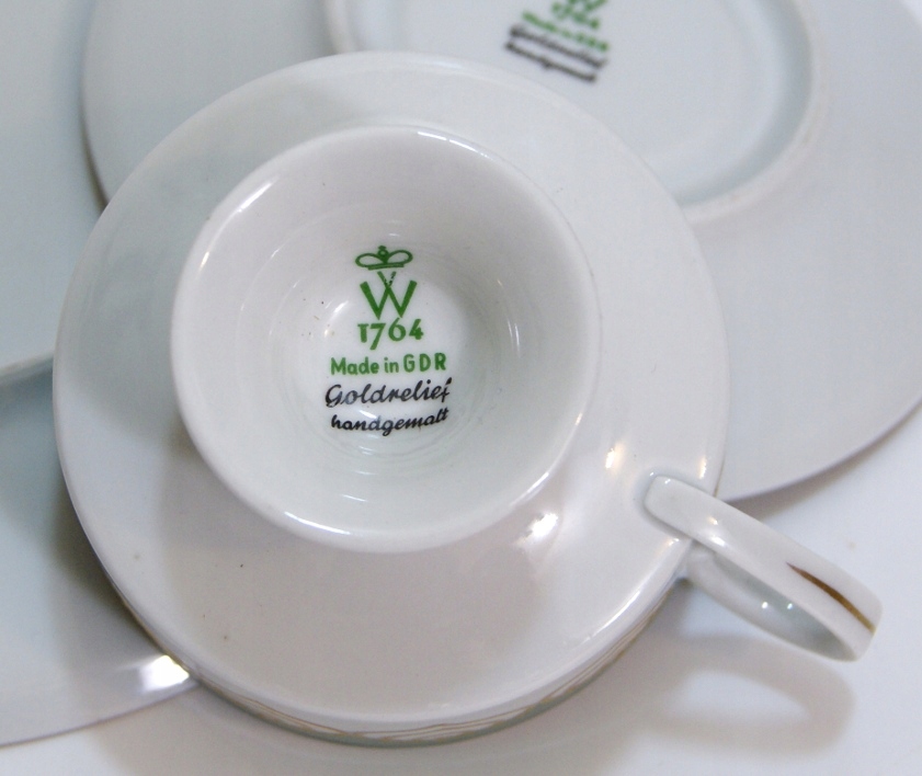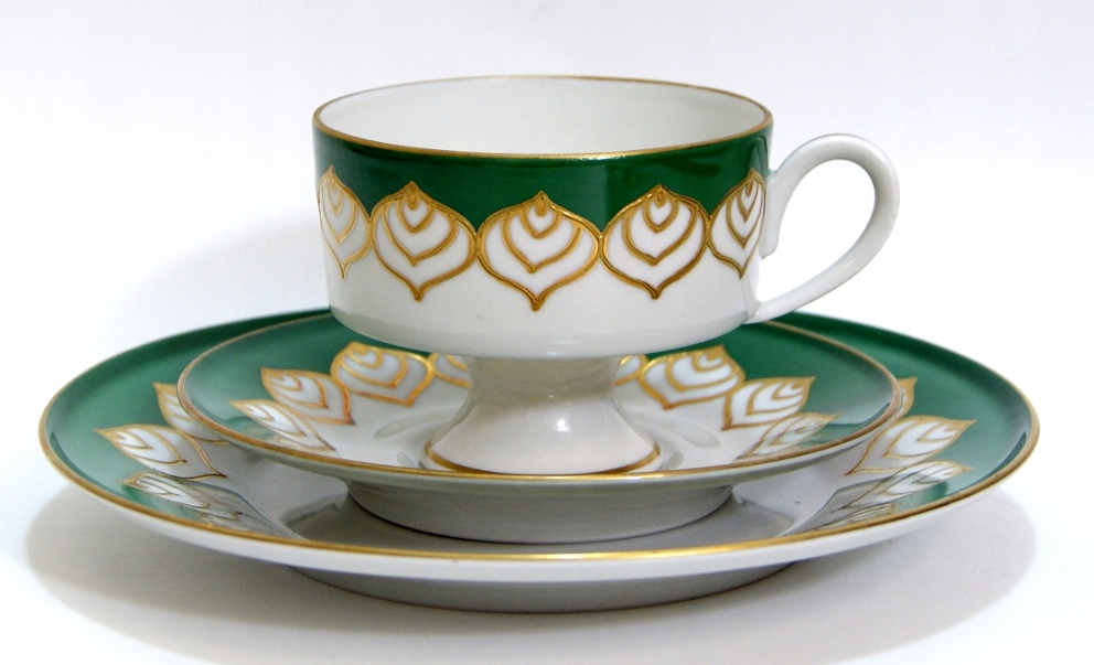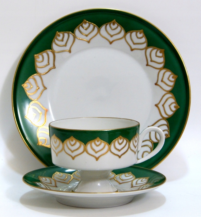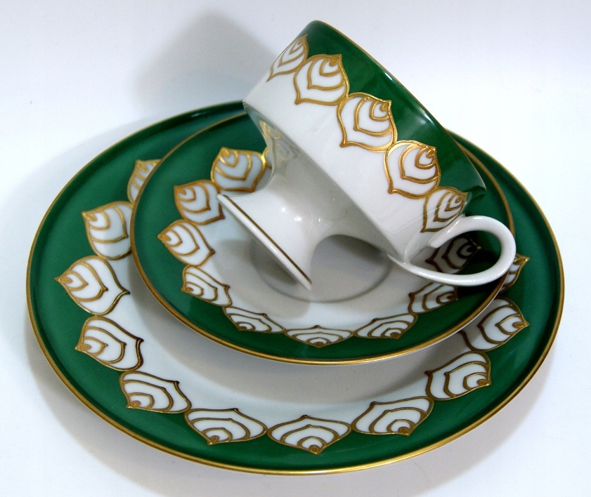 Предмет аукциона — красивый старинный сервиз для завтрака. Белый и зеленый фарфор, украшенный рельефно-выпуклым золотом. Чашка на ноге. Валлендорф.