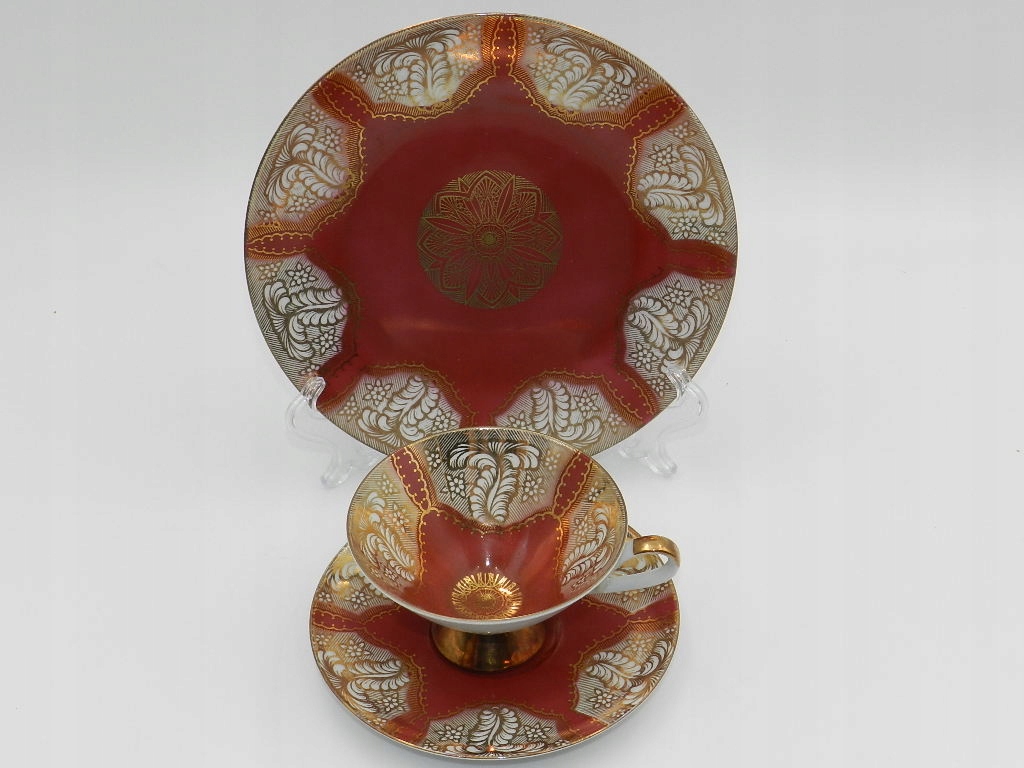 Высококачественный белоснежный фарфор изящной, стройной формы и красивой бордовой звездчатой росписью.