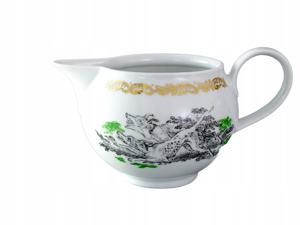 Красивый фарфоровый молочник с охотничьим мотивом.