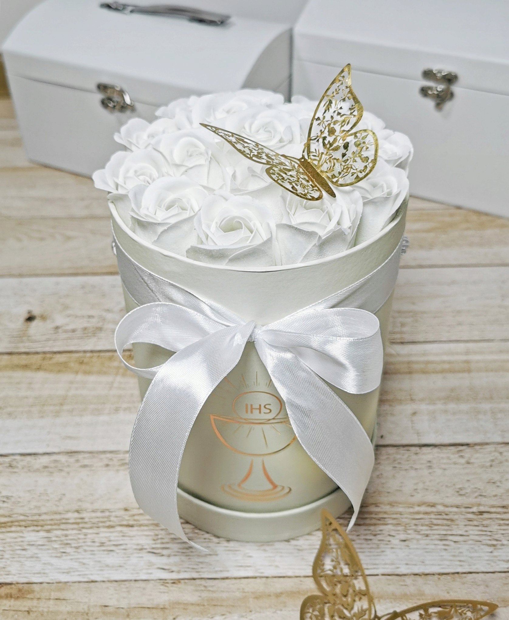 Цветочная коробка с принтом IHS, наполненная ароматным мылом в форме розы, шариком из гелиевой фольги, сувенирным дипломом и золотой бабочкой.