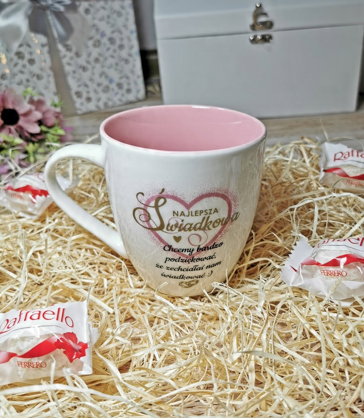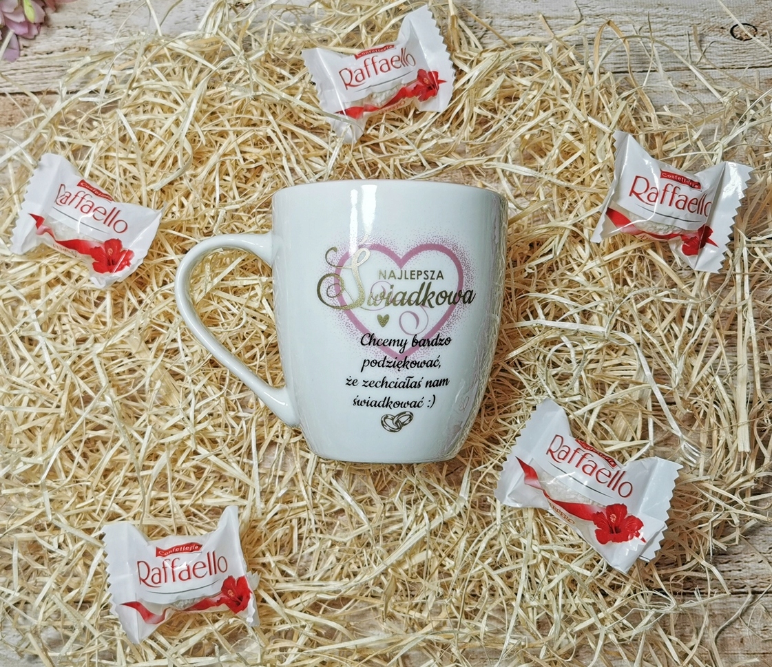 В комплект входит красивая бело-золотая бархатная шкатулка, наполненная сеном, золотая лента, кружка, украшенная красивой надписью «Лучший Свидетель, мы хотели бы поблагодарить вас за то, что вы были для нас свидетелем» Рафаэлло и золотая бабочка