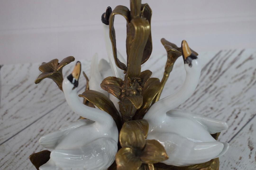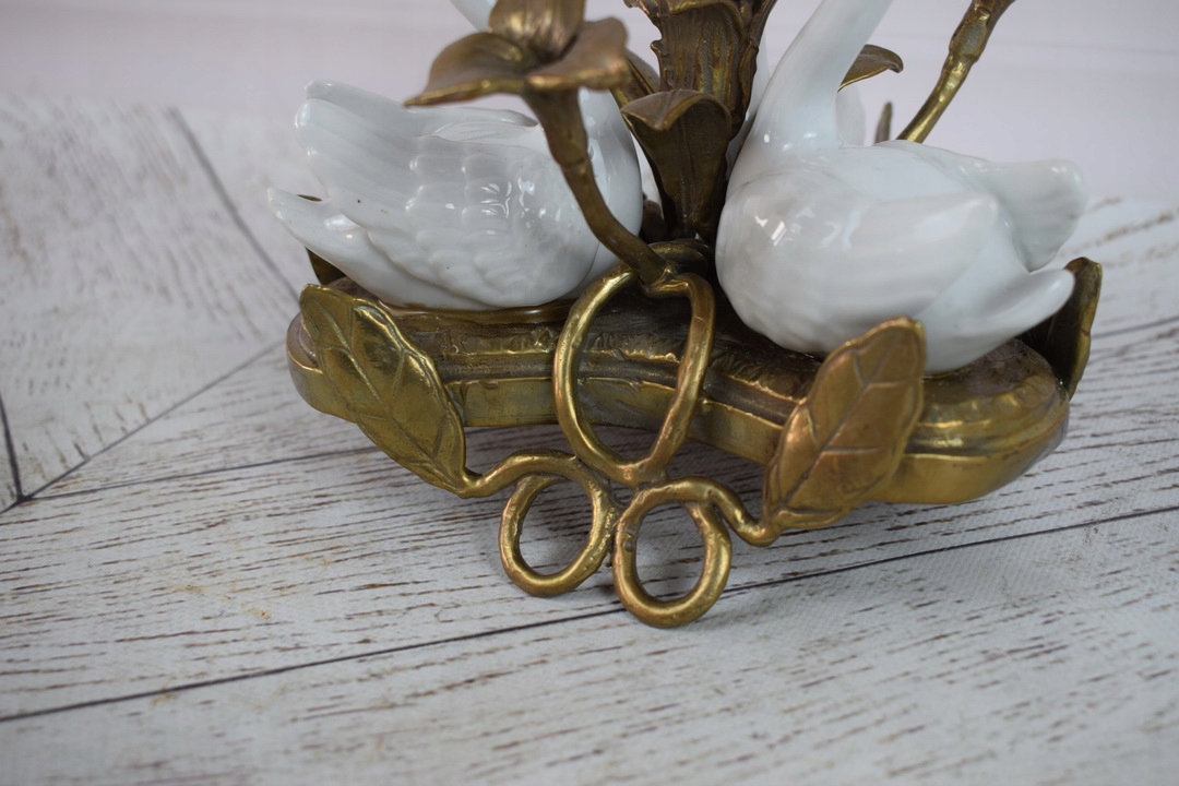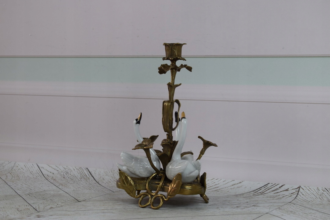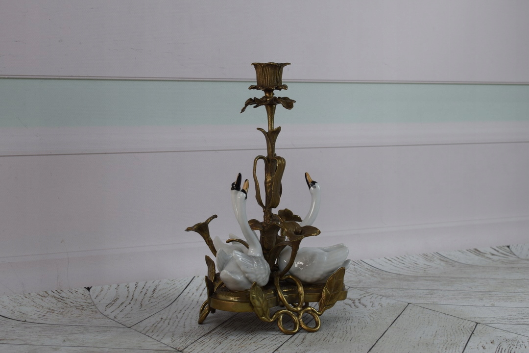 Красивый фарфоровый подсвечник - Три лебедя - фарфор + бронза - бронза