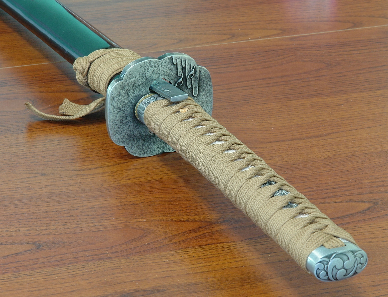 - Очень острый меч, порезы на полосах, удерживаемых вертикально лист из принтера (Habaki), Цуба с мотивом летающих кранов, двух менуки и прокладки (Seppa) и остальные латунные сплавы- как на фотографии. Светло-коричневый шелк (Rayon). Эластичная катана, с очень хорошей геометрией лезвия, идеально подходит для обучения. В ручке без малейшей слабых. > P>- Длина лезвия, лезвие для горшка (Tsuba)- 73 см, длина ножа шириной 20 см 12 мм. В Sayi 103 см.