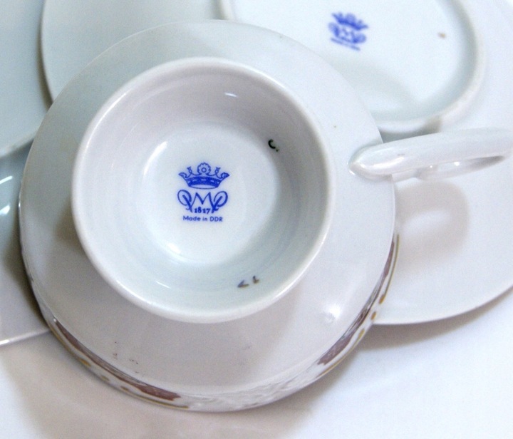 Предмет аукциона — красивый старинный сервиз для завтрака из белого фарфора с богатым рельефом, украшенный золотом и цветочным узором. PMP Германия.