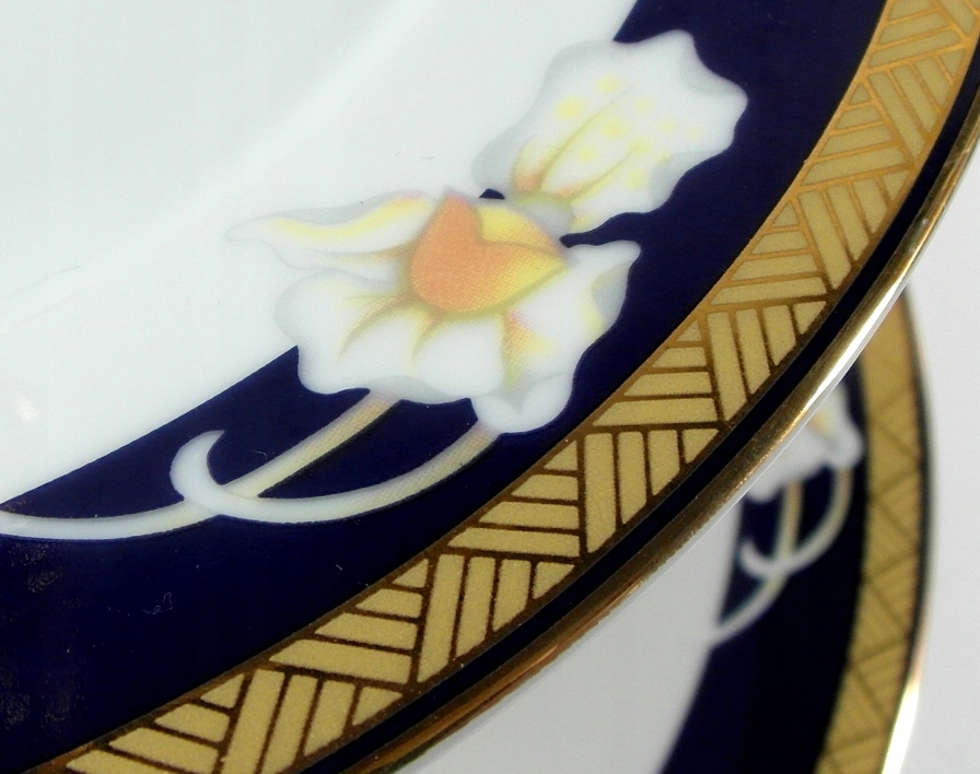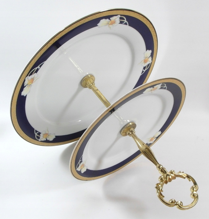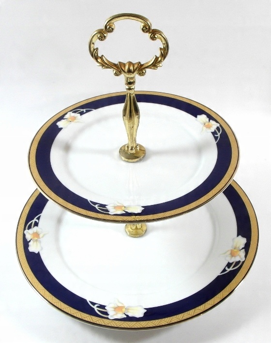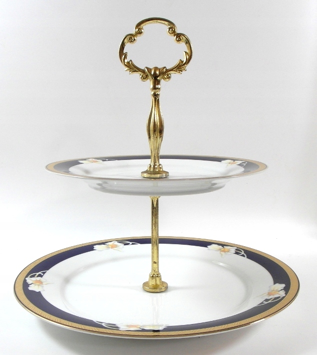 Предмет аукциона — красивая старинная подставка для торта из белого фарфора, украшенная кобальтом, цветами и золотом, со старинной металлической ручкой.