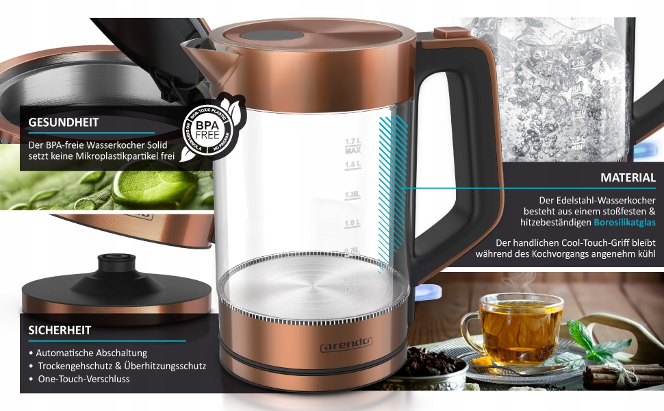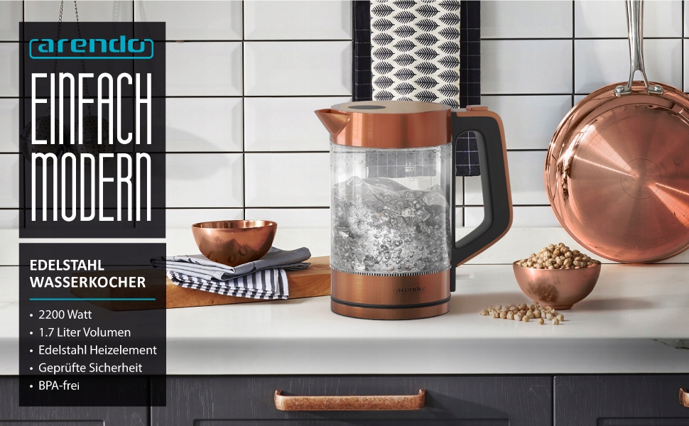 Вечная элегантность для кухни с чайником из прочного стекла из нержавеющей стали Arendo с его мощным дизайном и BPA Solid — отличный выбор для тех, кто ищет альтернативу пластиковым чайникам. Убедитесь сами: Характеристики продукта: Водоварка из нержавеющей стали емкостью 1,7 л с боросиликатным стеклом Скрытый нагревательный элемент из нержавеющей стали: Легкая очистка, энергосберегающий нагрев для нагрева Закрытие для быстрого закрытия без помощи рук Прохладная сенсорная ручка в форме отверстия в форме крышки 1 переключатель с синяя контрольная лампочка Внешний индикатор уровня на стеклянном корпусе360° для удобного подъема и парковки Центр со встроенным контроллером управления кабельным проводом (ручное и автоматическое отключение) Защита от перегрева + выдвижное укрытие для сухих ног (для устойчивой стойки практически на любой поверхности) Размеры: высота Размер: 24 см / Ширина: 14 см / Длина: 24 см | Длина кабеля питания: около 75 см Вес: 985 г Чайник + базовый блок 205 г | Цвет: медь Материал: боросиликатное стекло Резервуар для воды / Корпус из матовой нержавеющей стали / Ручка из пластика из нержавеющей стали / Пластиковая основа (черная / матовая с орнаментом из нержавеющей стали) Комплект поставки: Чайник Arendo Solid из нержавеющей стали + Руководство пользователя Технические данные Мощность питание: 220–240 В, 50/60. Сертификат для путешествий: 1850–2200. Количество WFÜLL: макс. 1,7 л. Пробка: Schuko Type F CEE 7/7