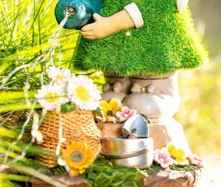 - Отлитое из прочной и высококачественной смолы садовое украшение «Гномик» прочное, долговечное, водонепроницаемое и устойчивое к выцветанию.
