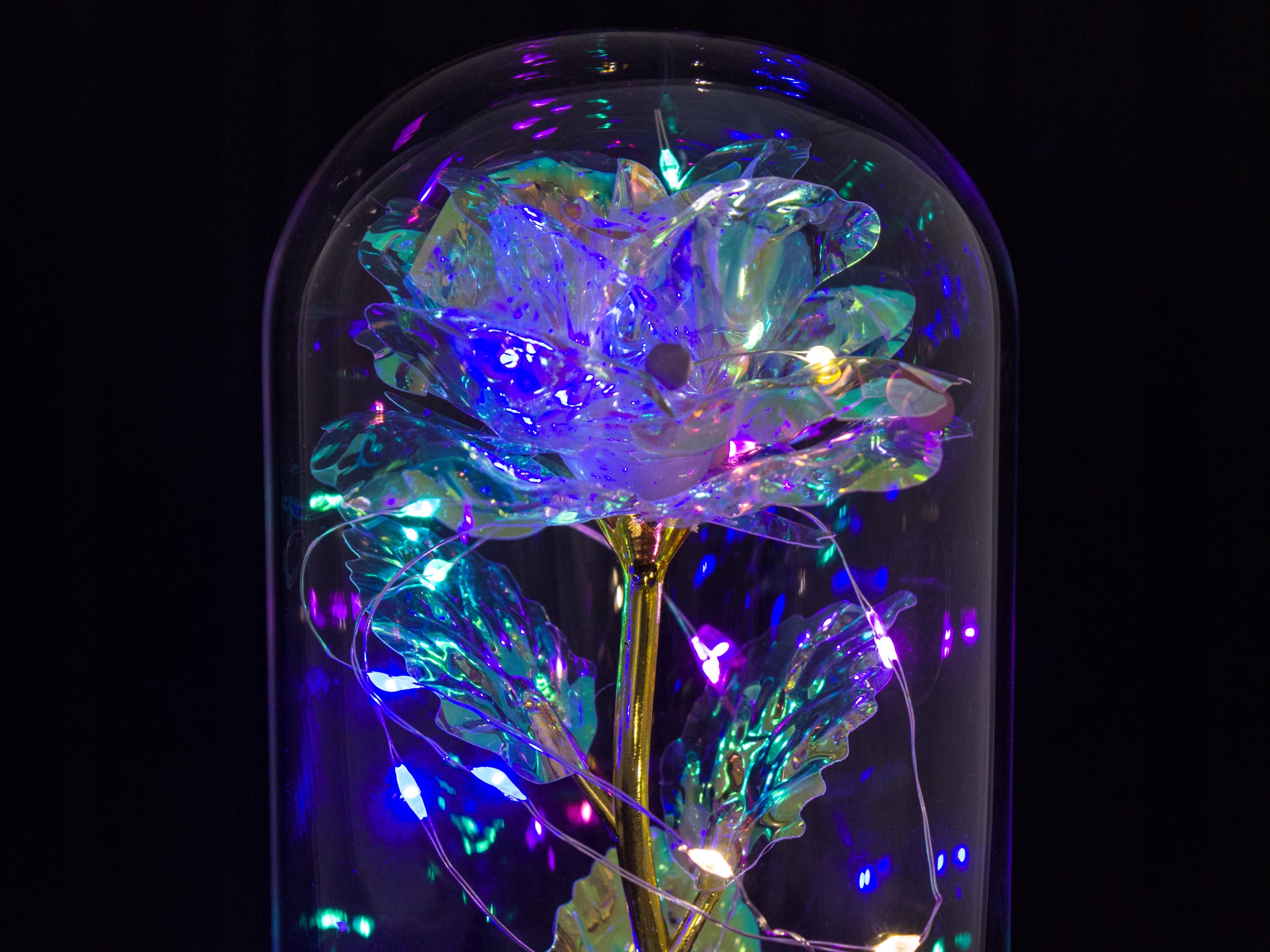 Эта точно изготовленная роза, символ любовь была помещена в красивый стеклянный купол, сквозь который ее красоту можно увидеть постоянно, даже в темноте, поскольку он освещен 20 светодиодными фонарями, окружающими его.
