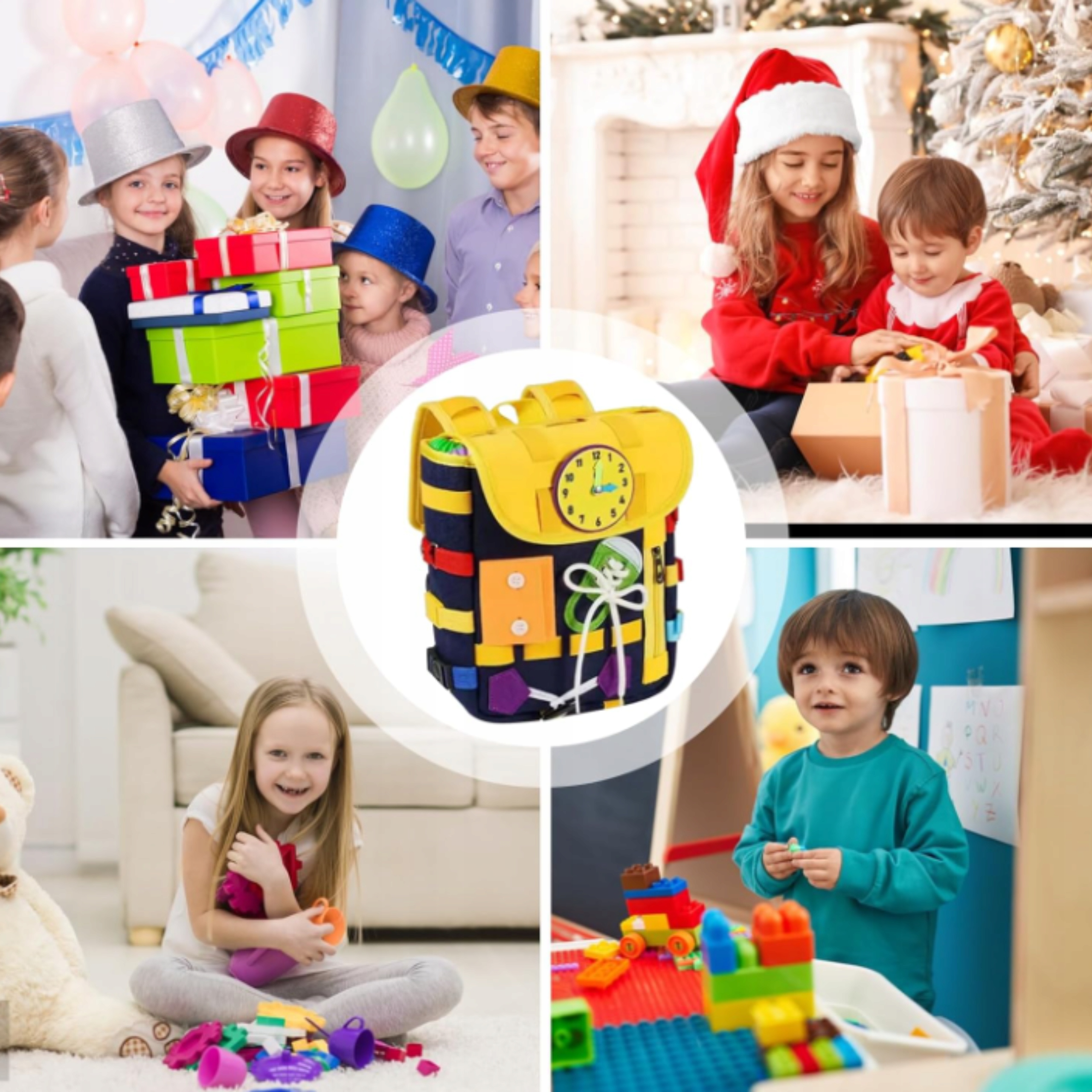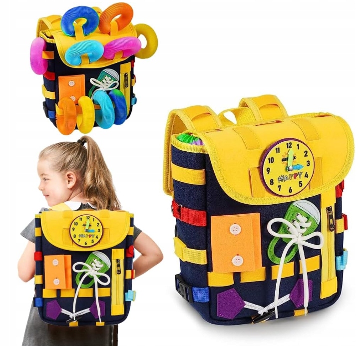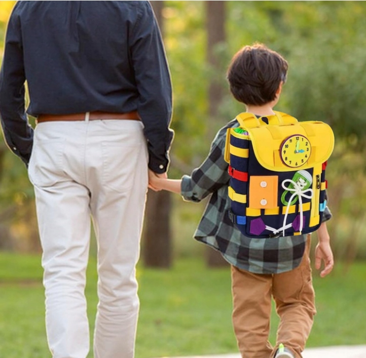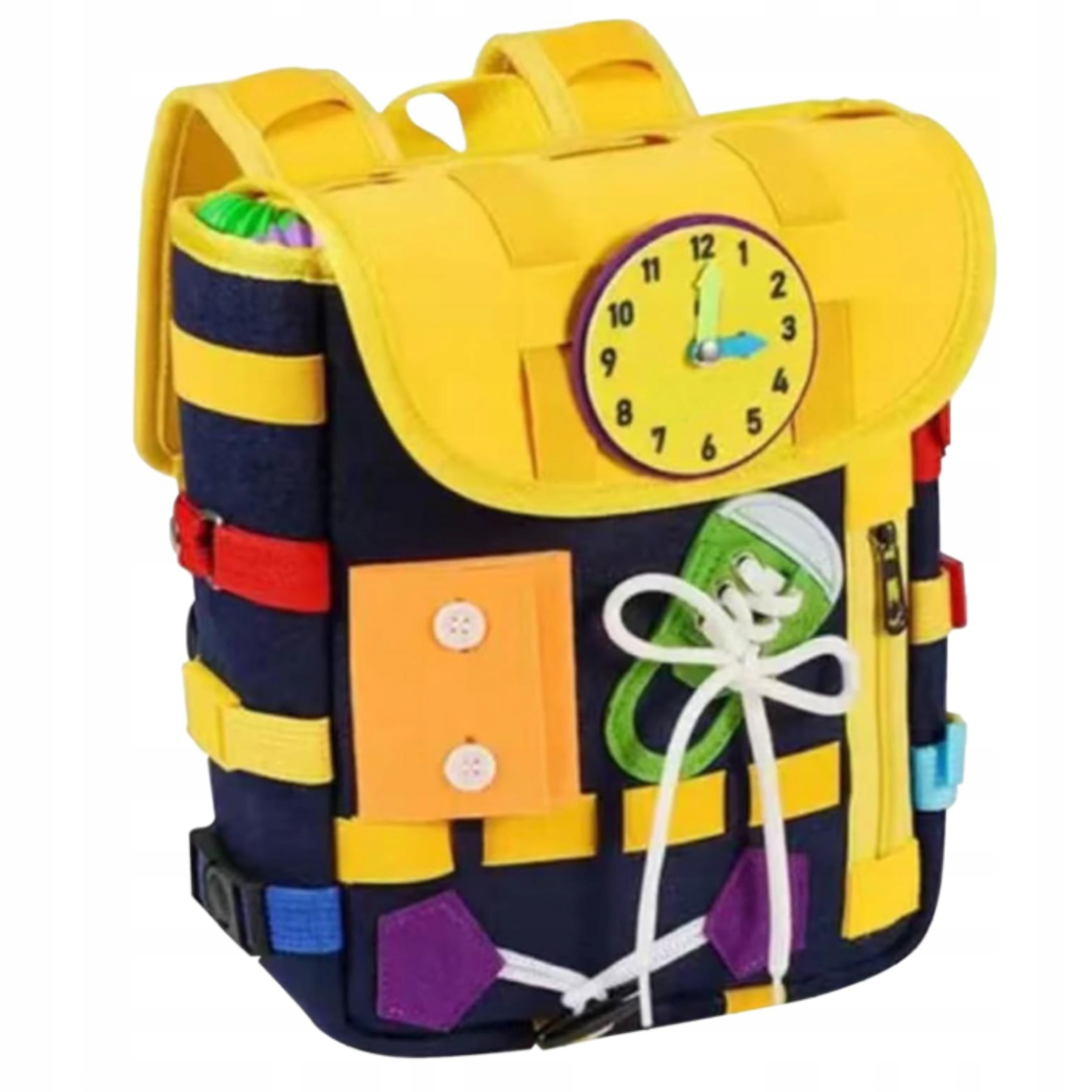 Уникальный рюкзак Монтессори действует как сенсорная доска, которая развивает навыки ребенка в результате игры.