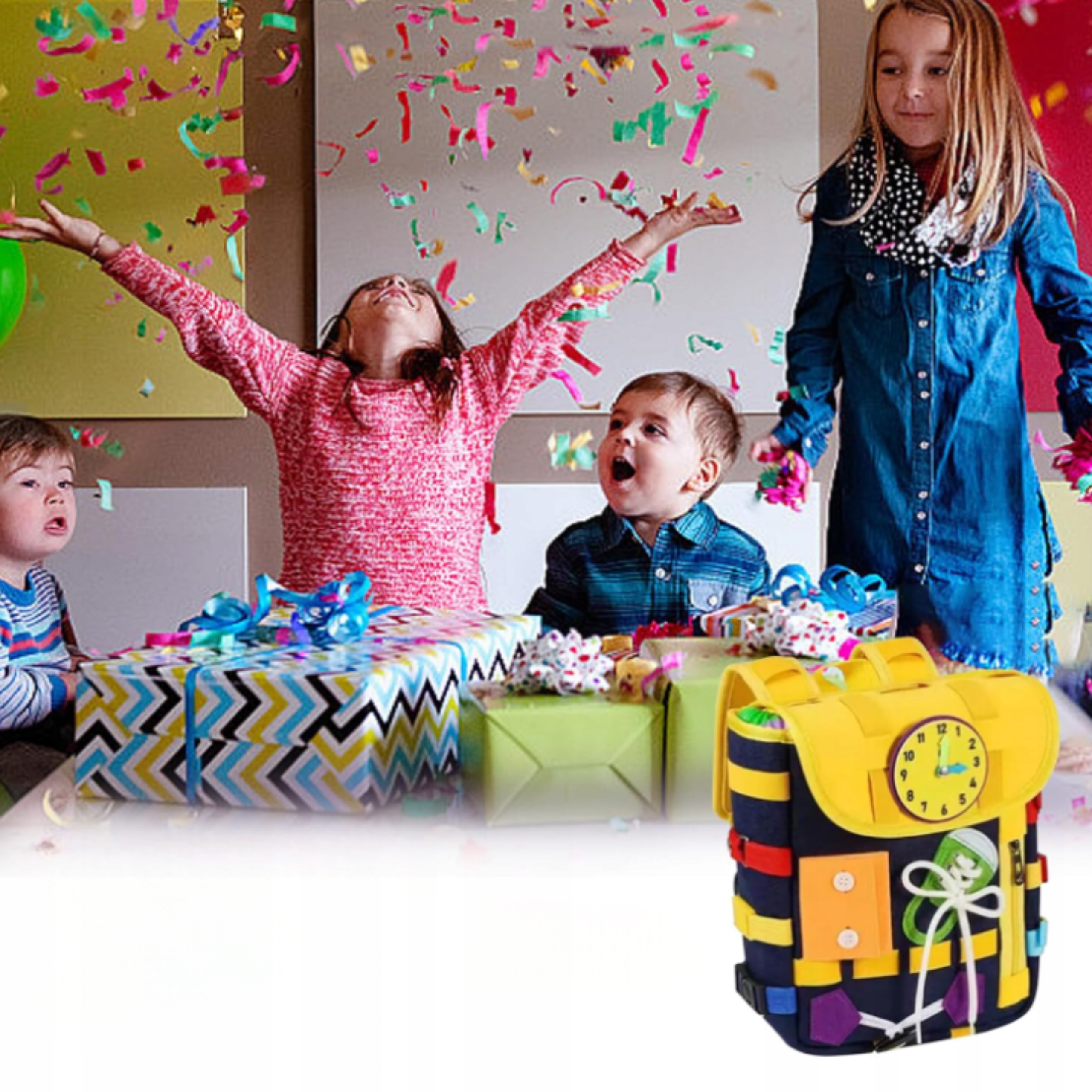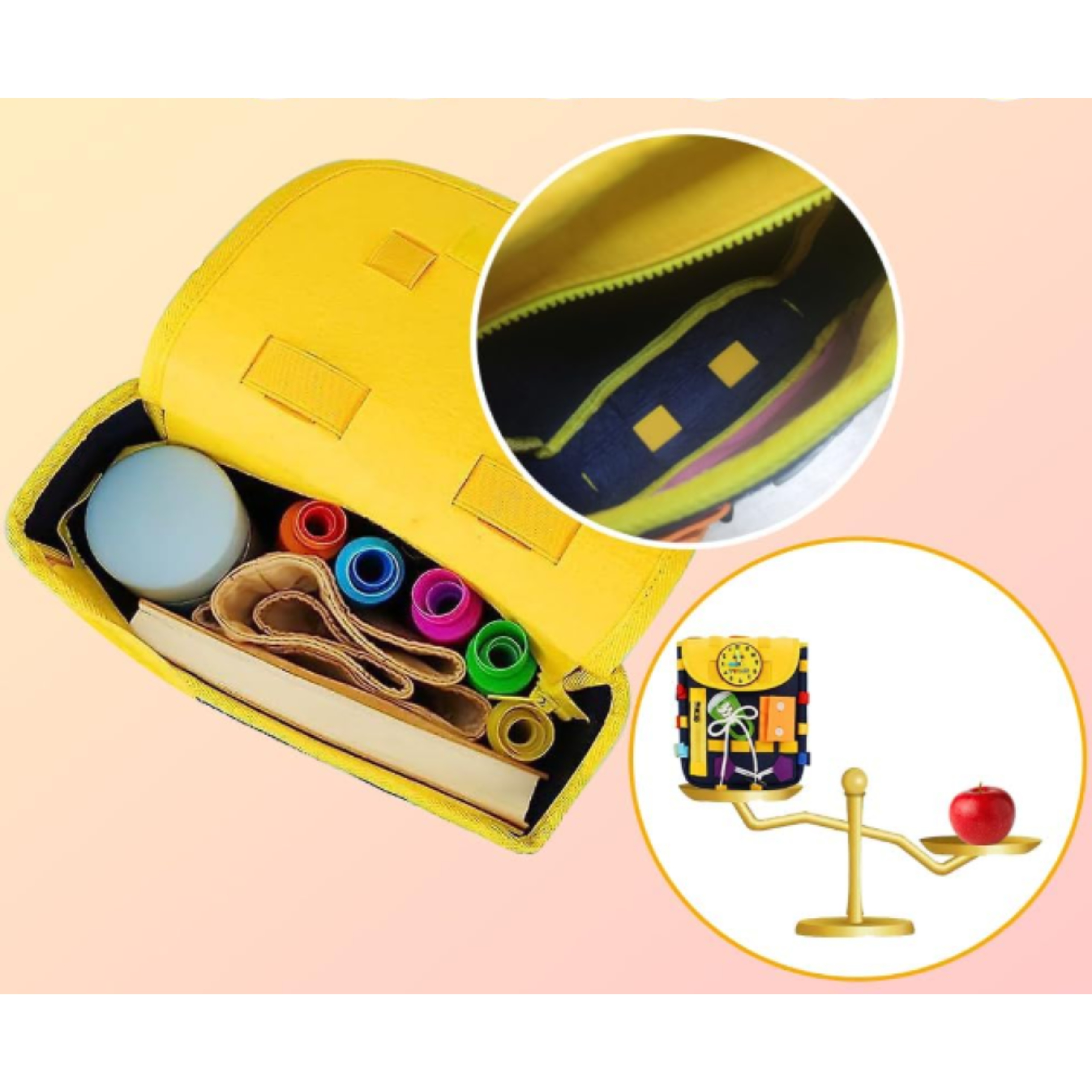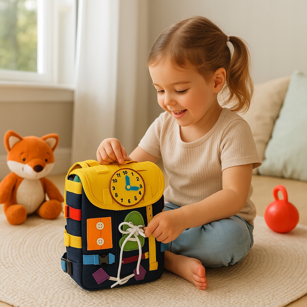 Уникальный рюкзак Монтессори действует как сенсорная доска, которая развивает навыки ребенка в результате игры.