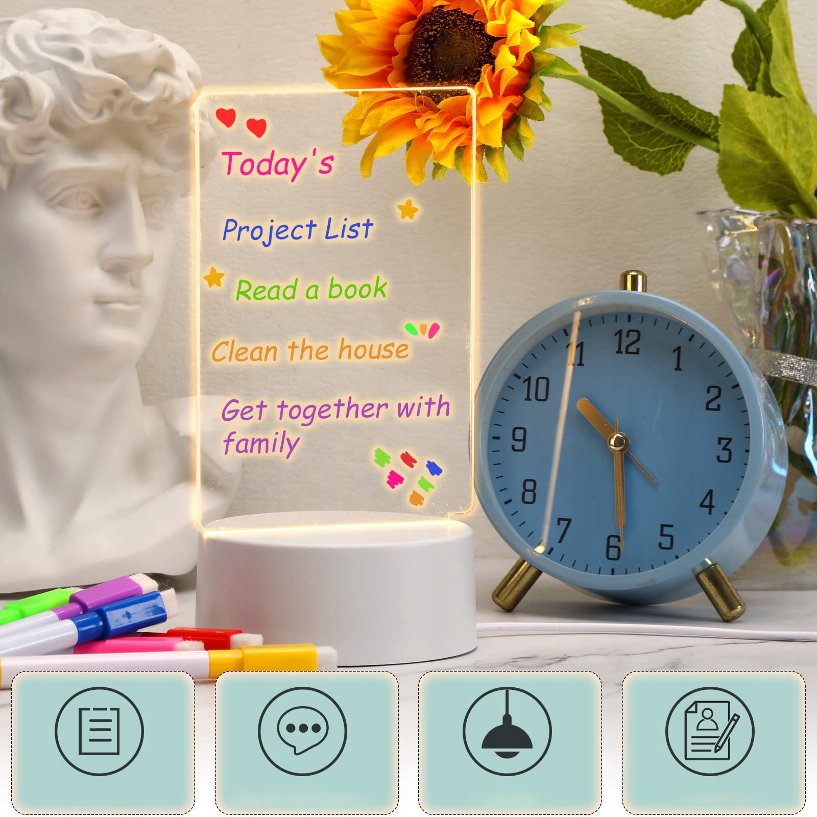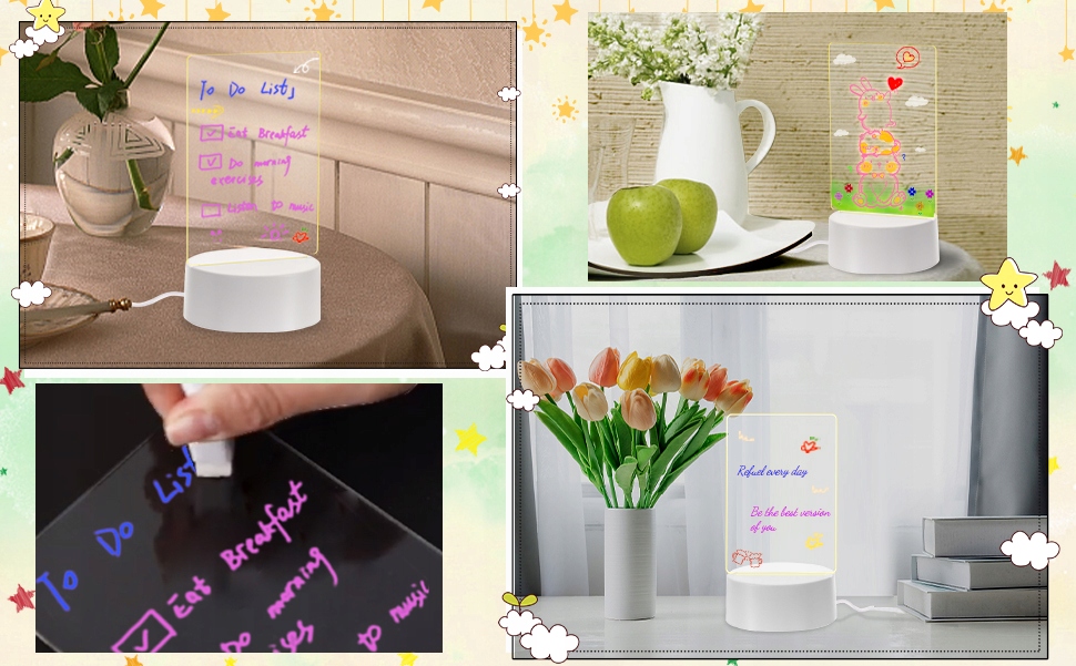 ✨Легко использовать Чистота: Этот креативный светодиодный ночник для досок для заметок можно использовать повторно, и его легко чистить. Просто запишите свои хорошие идеи или заметки и легко сотрите их влажной тканью или салфеткой из микрофибры, чтобы каждый раз начинать все сначала. Перед использованием снимите двустороннюю защитную пленку с акриловой доски.
