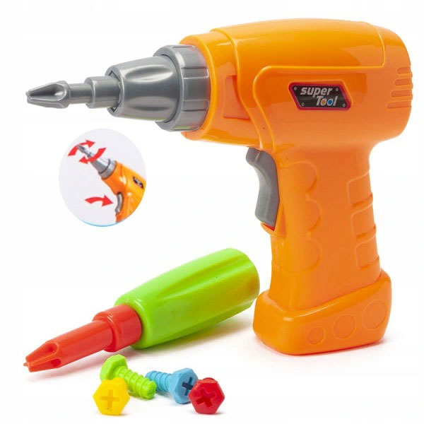 В набор входитдрель с вращающимся сверлом, что делает игру с пазлом более увлекательной, а также разноцветные шурупы и шайбы.