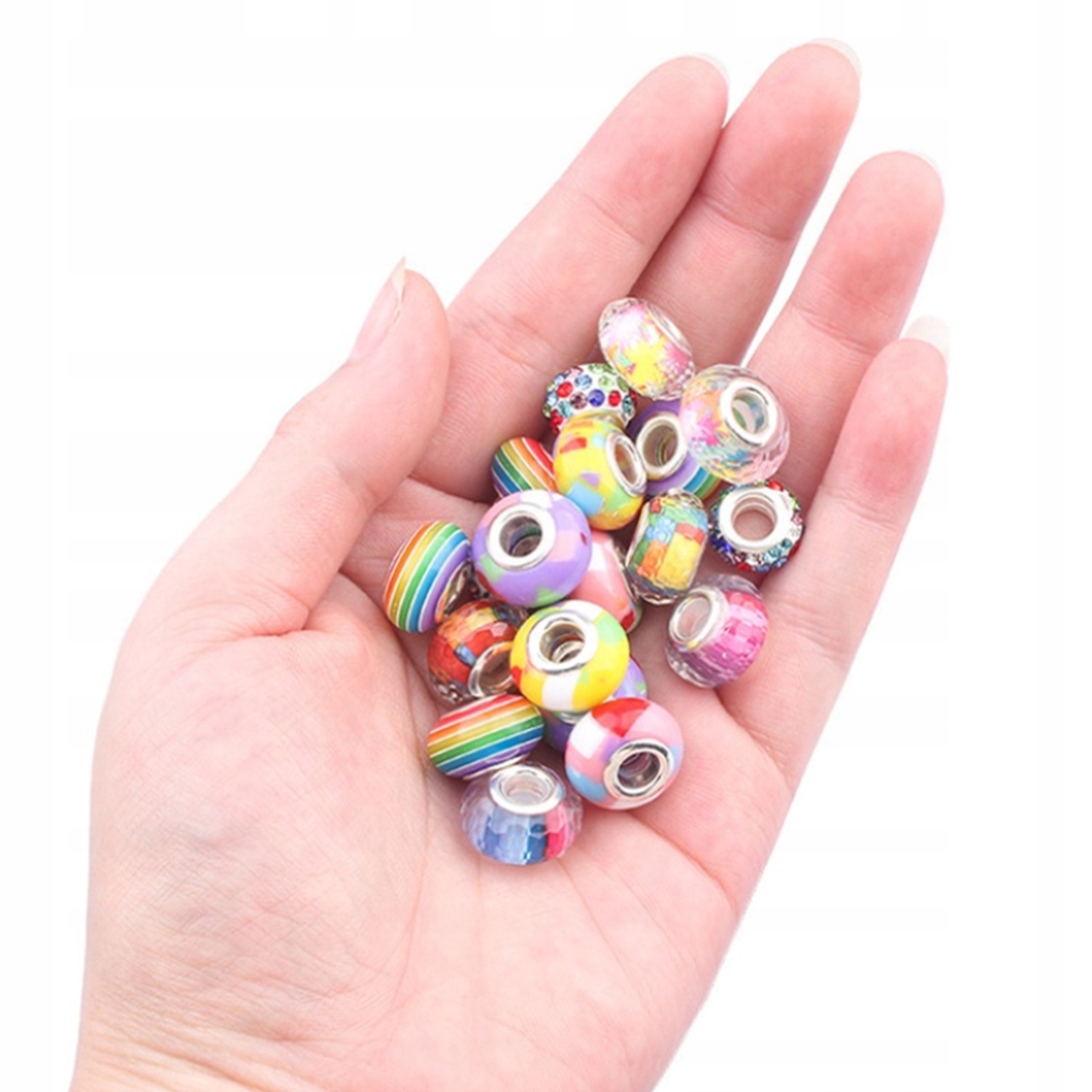 В набор входят разноцветные и металлические бусины различной формы, а также металлические бусины с различными подвесками. Все элементы можно нанизать на один из пяти браслетов или пяти ремешков, длина которых регулируется.